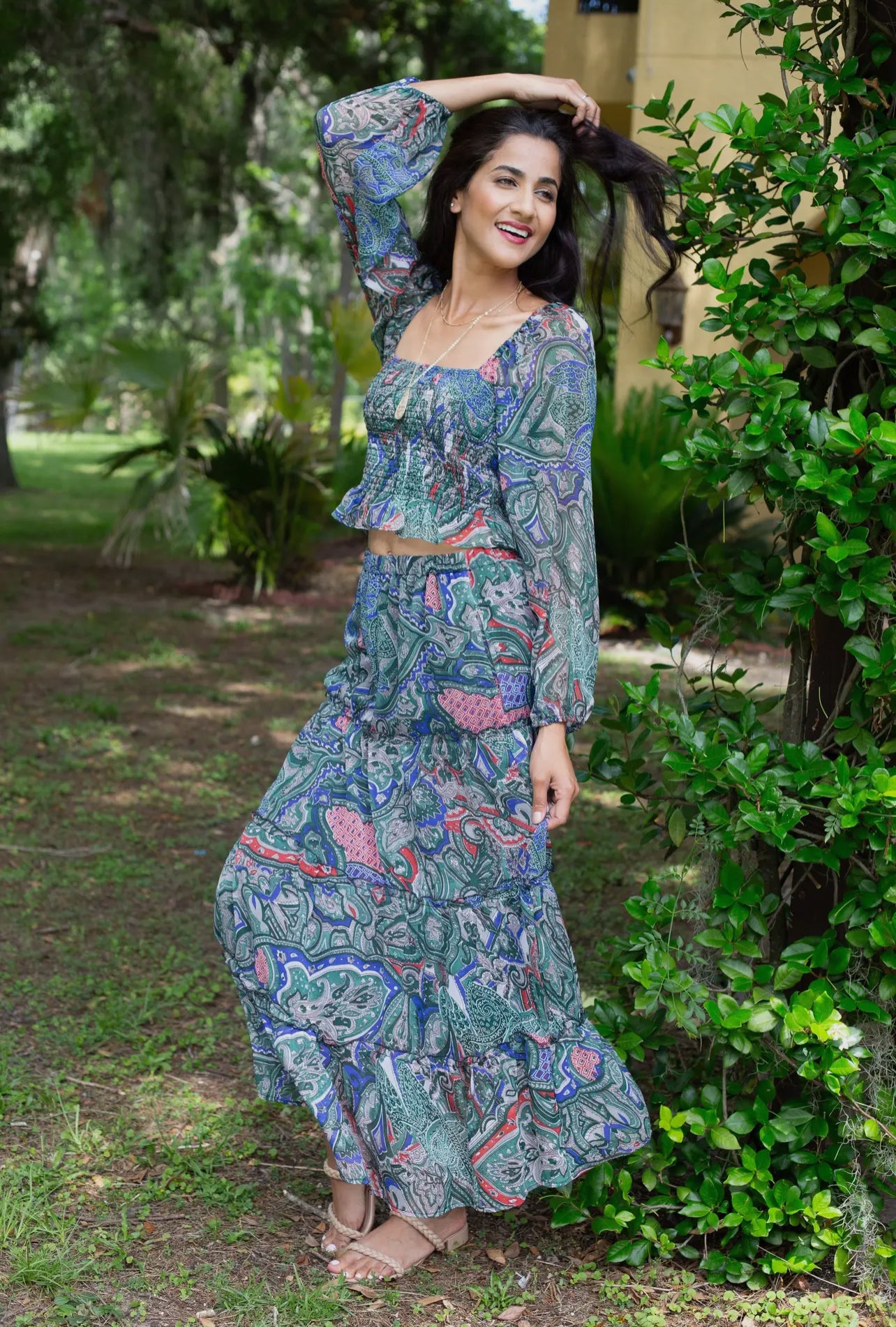 (Top Sold Separately) "The Sacred Threads Imperial Chiffon Boho Paisley Maxi Skirt is a statement piece that embodies the essence of bohemian elegance. Crafted from lightweight chiffon, this maxi skirt features a mesmerizing paisley pattern in a vibrant mix of colors that flow effortlessly with every step. The tiered design adds volume and movement, making it perfect for twirling at festivals or casual weekend outings. The elastic waistband ensures a comfortable fit, allowing you to style it high on the waist or low on the hips. Pair this stunning skirt with the matching crop top for a coordinated boho-chic ensemble, or style it with a simple tank or tee for a more relaxed look. Whether you're dressing it up with heels or keeping it casual with sandals, the Sacred Threads Imperial Chiffon Boho Paisley Maxi Skirt is a versatile addition to any wardrobe, offering both style and comfort."