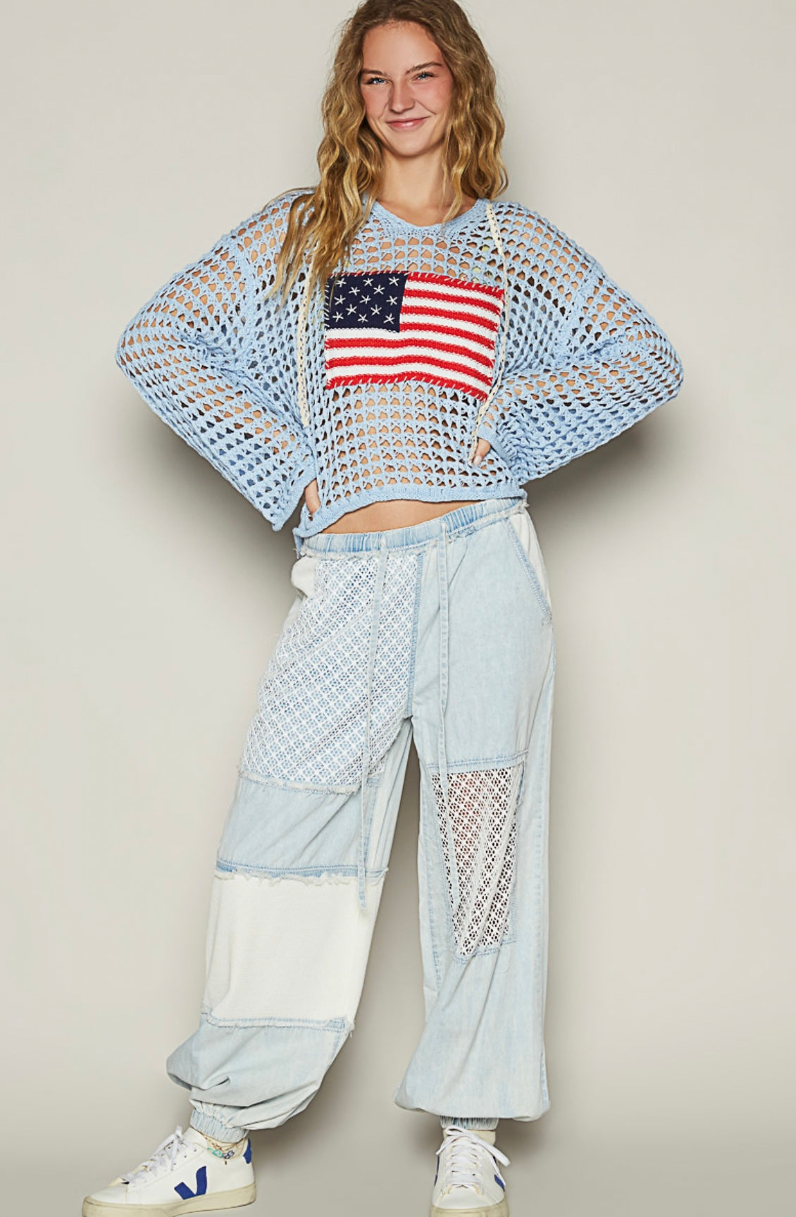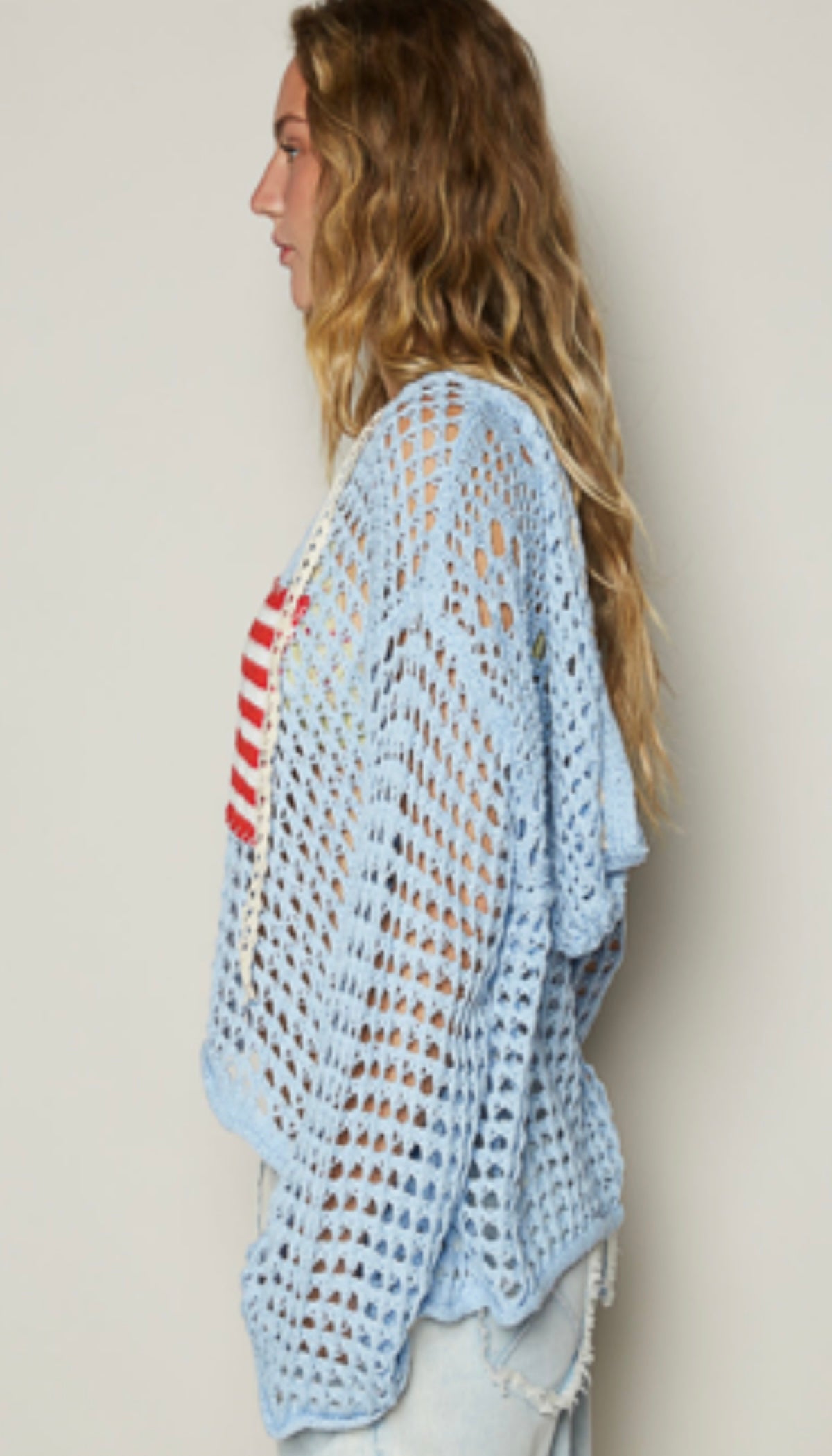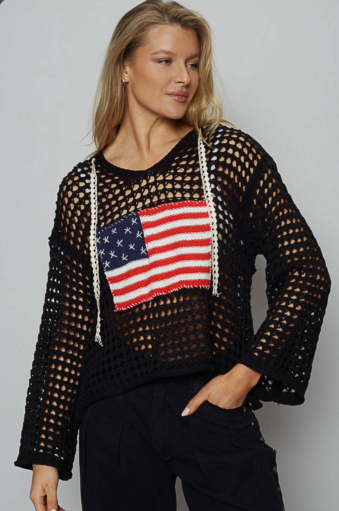 Designed in V-neck long sleeve regular fit hoodie sweater top in cotton with American flag, stitch point, rolling edge, trim loop, solid color. Oversized, loose fit