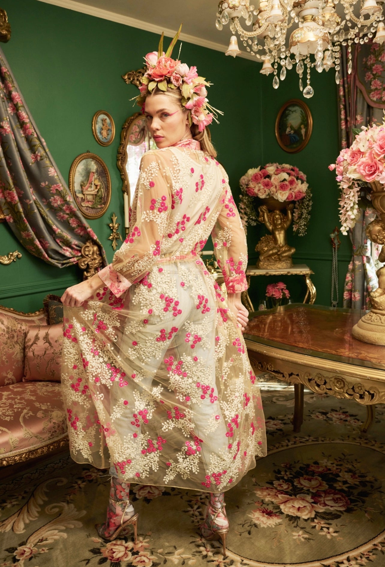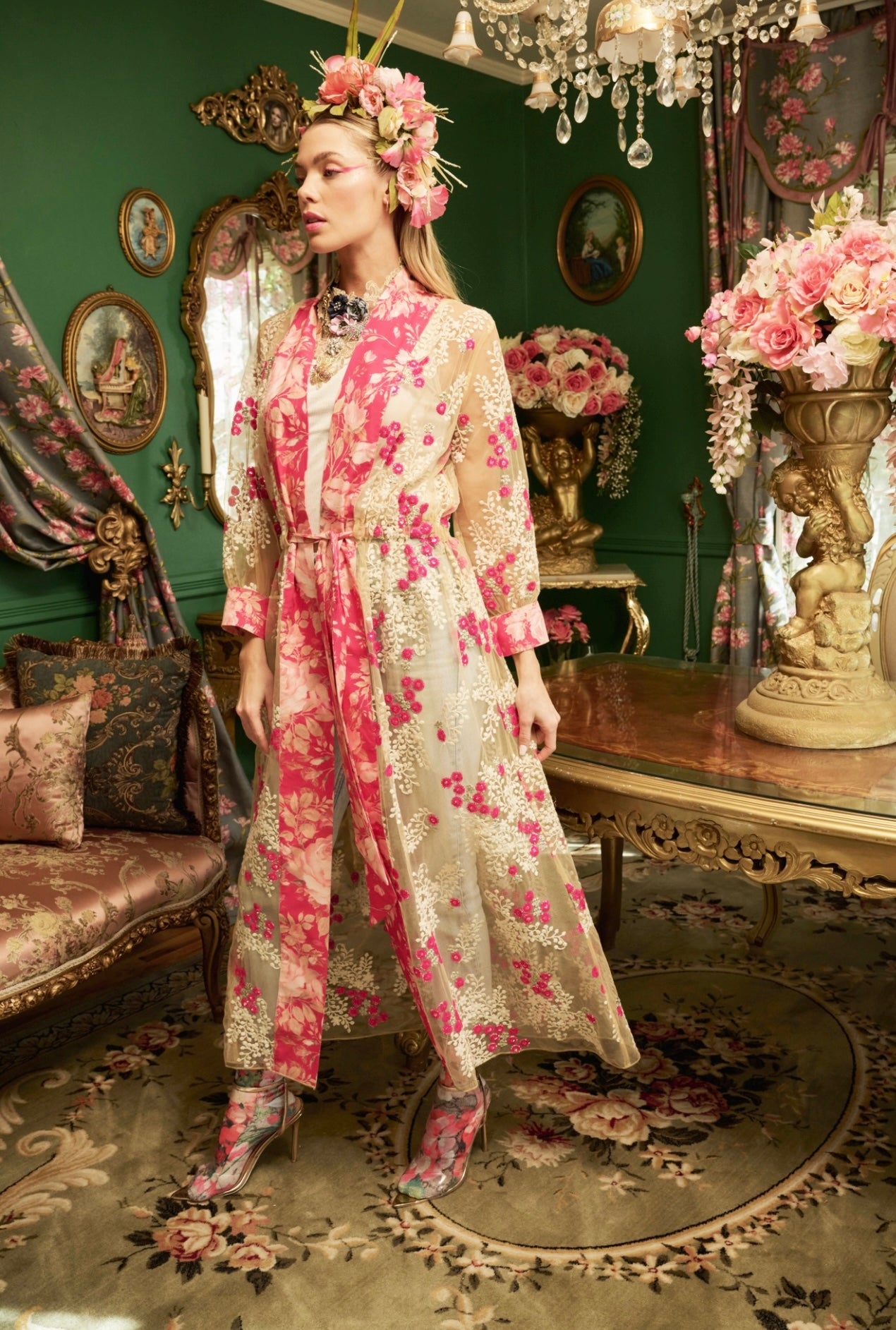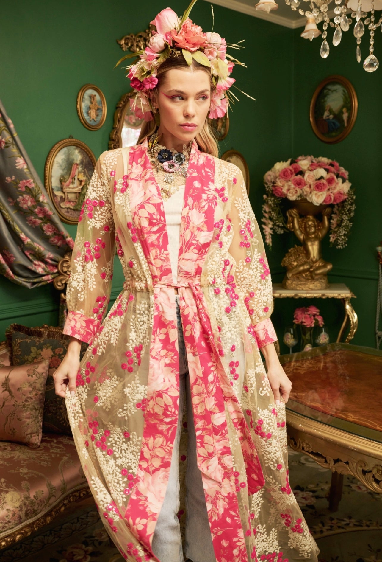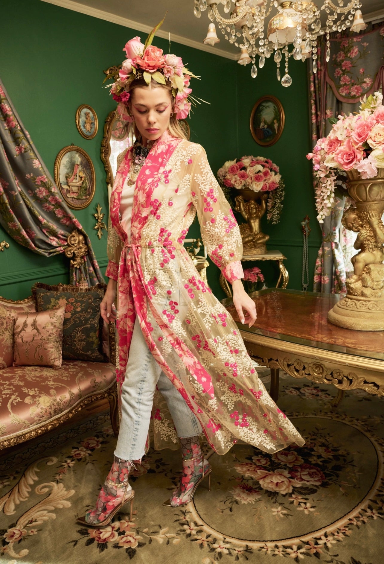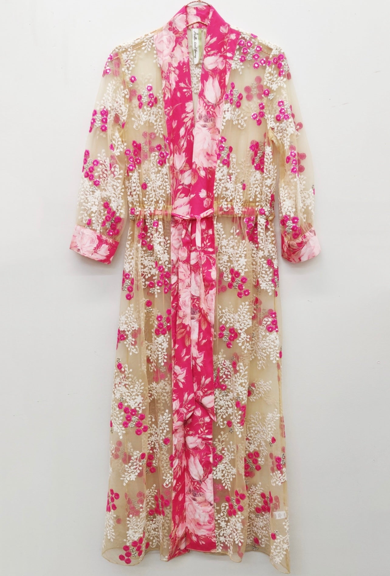 - Sequin embroidered mesh duster with floral print CF placket, belt & cuffs