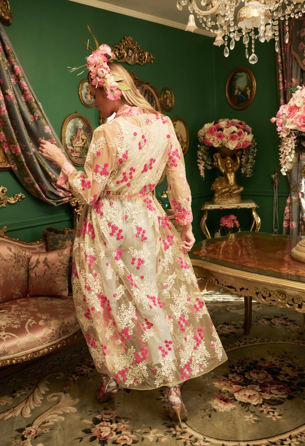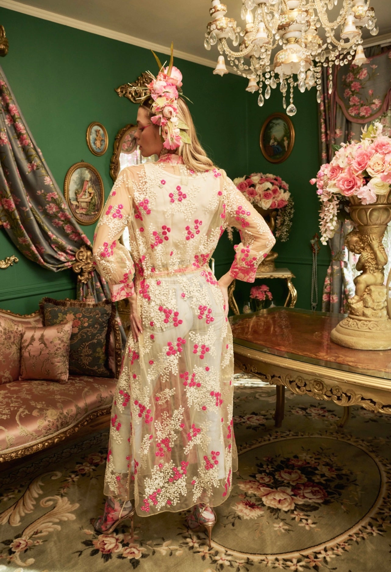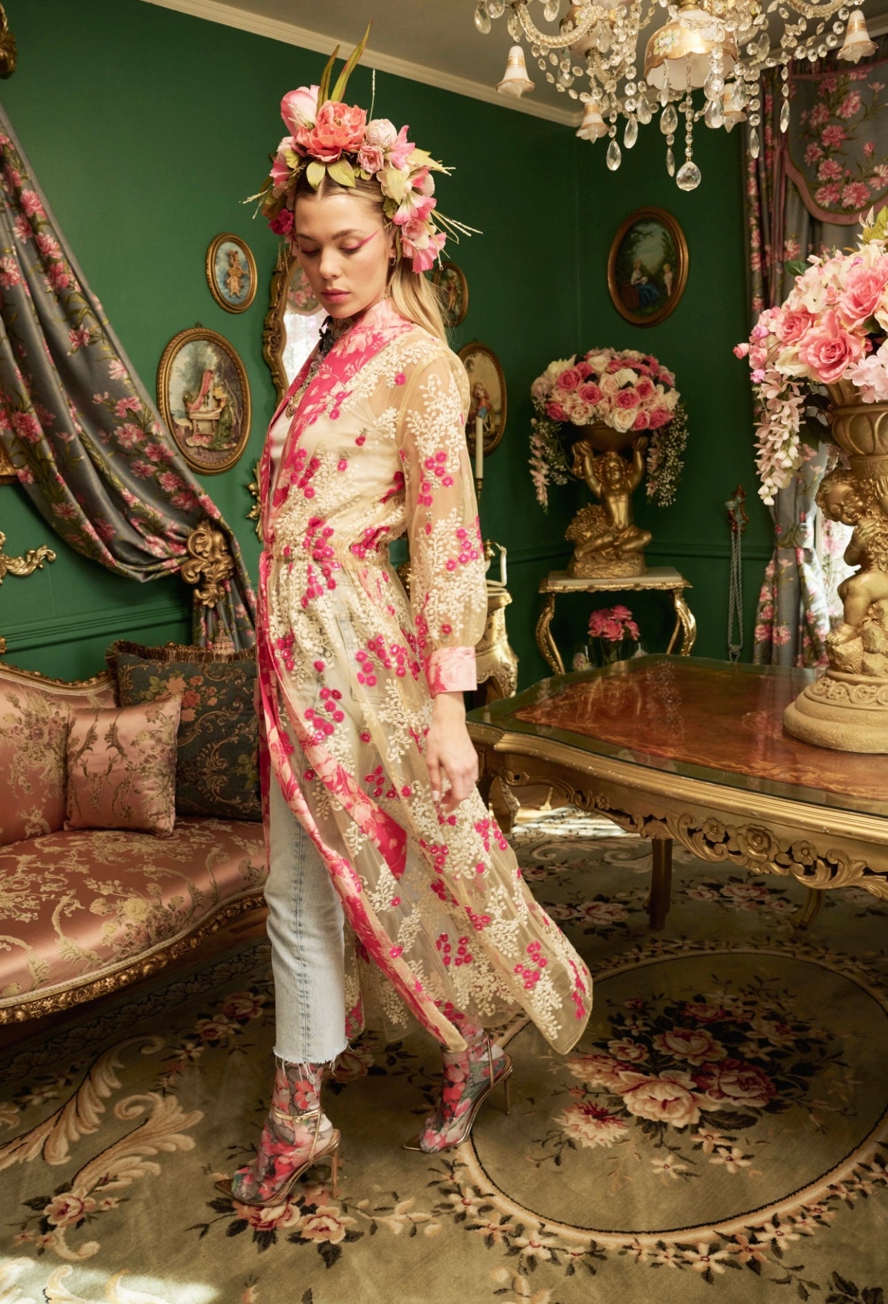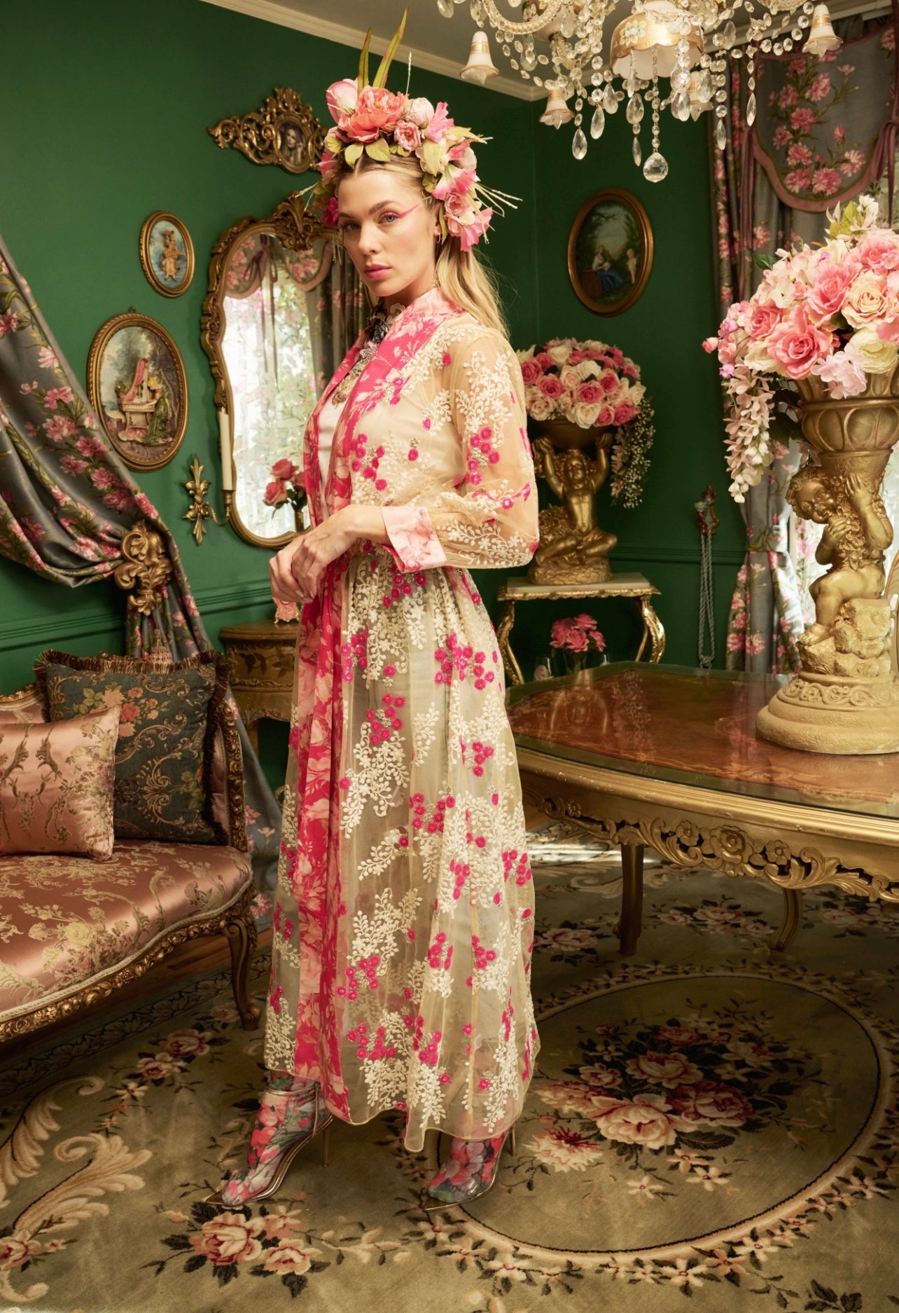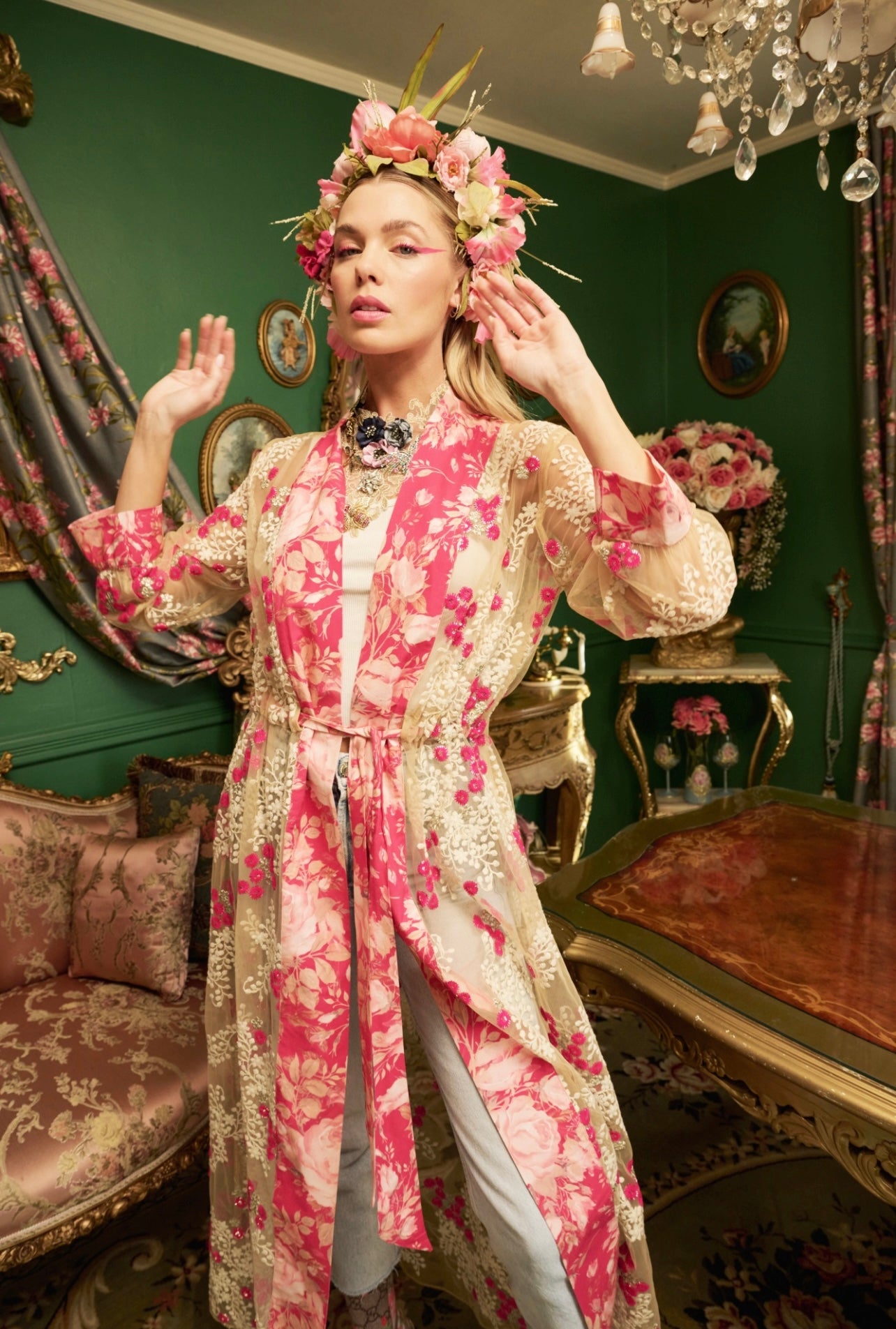 - Sequin embroidered mesh duster with floral print CF placket, belt & cuffs