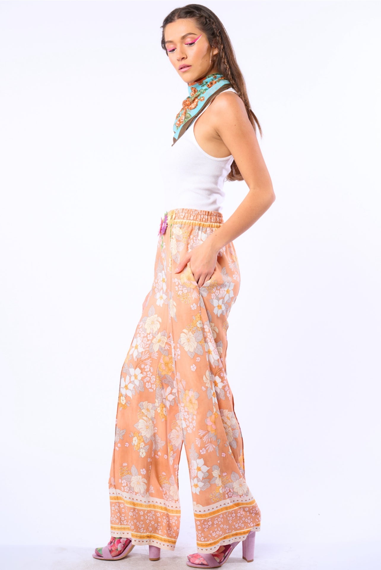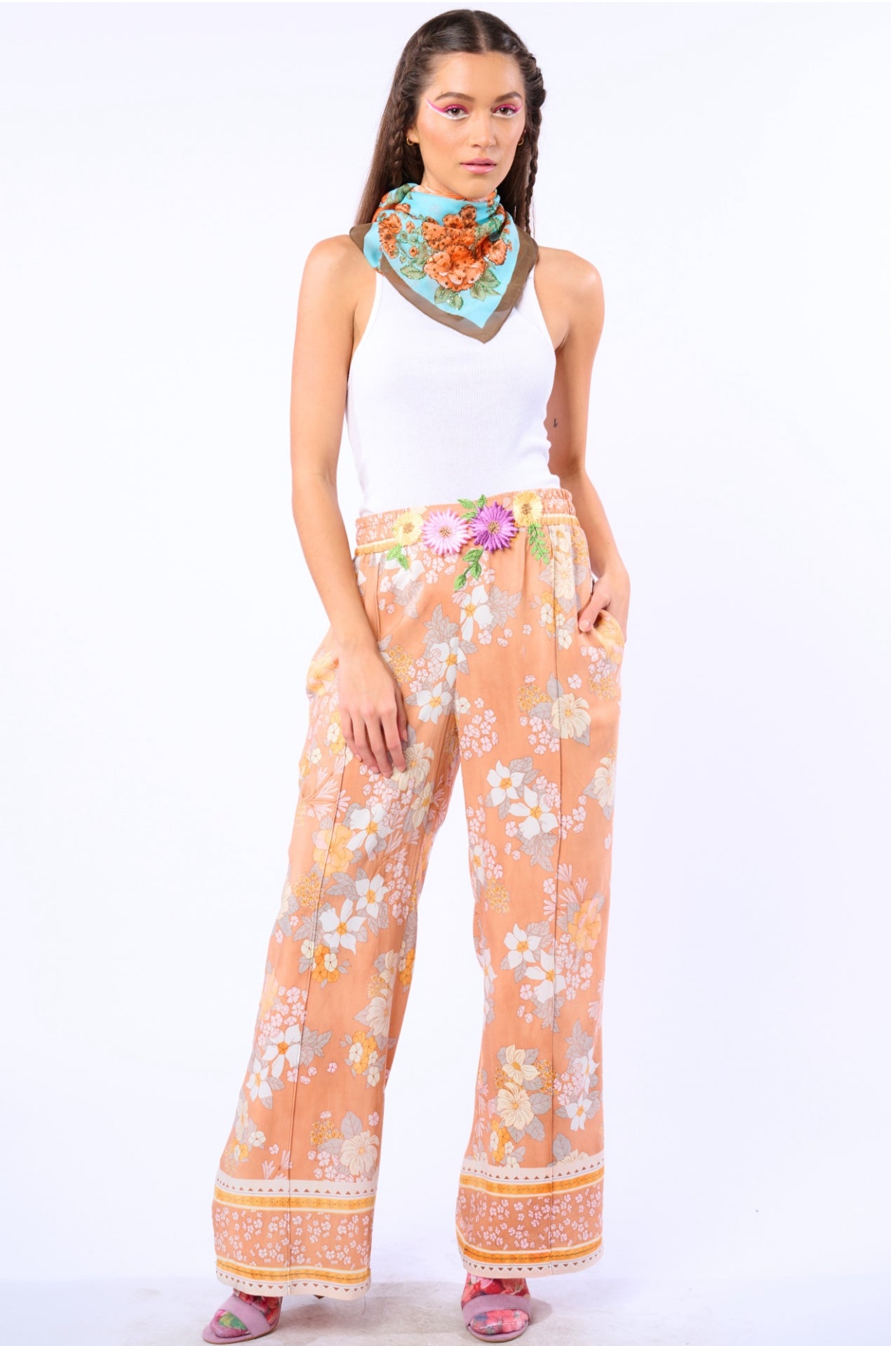 - Washed floral print elastic waist pants, embroidered floral patches embellished on front waist, 2 side pockets