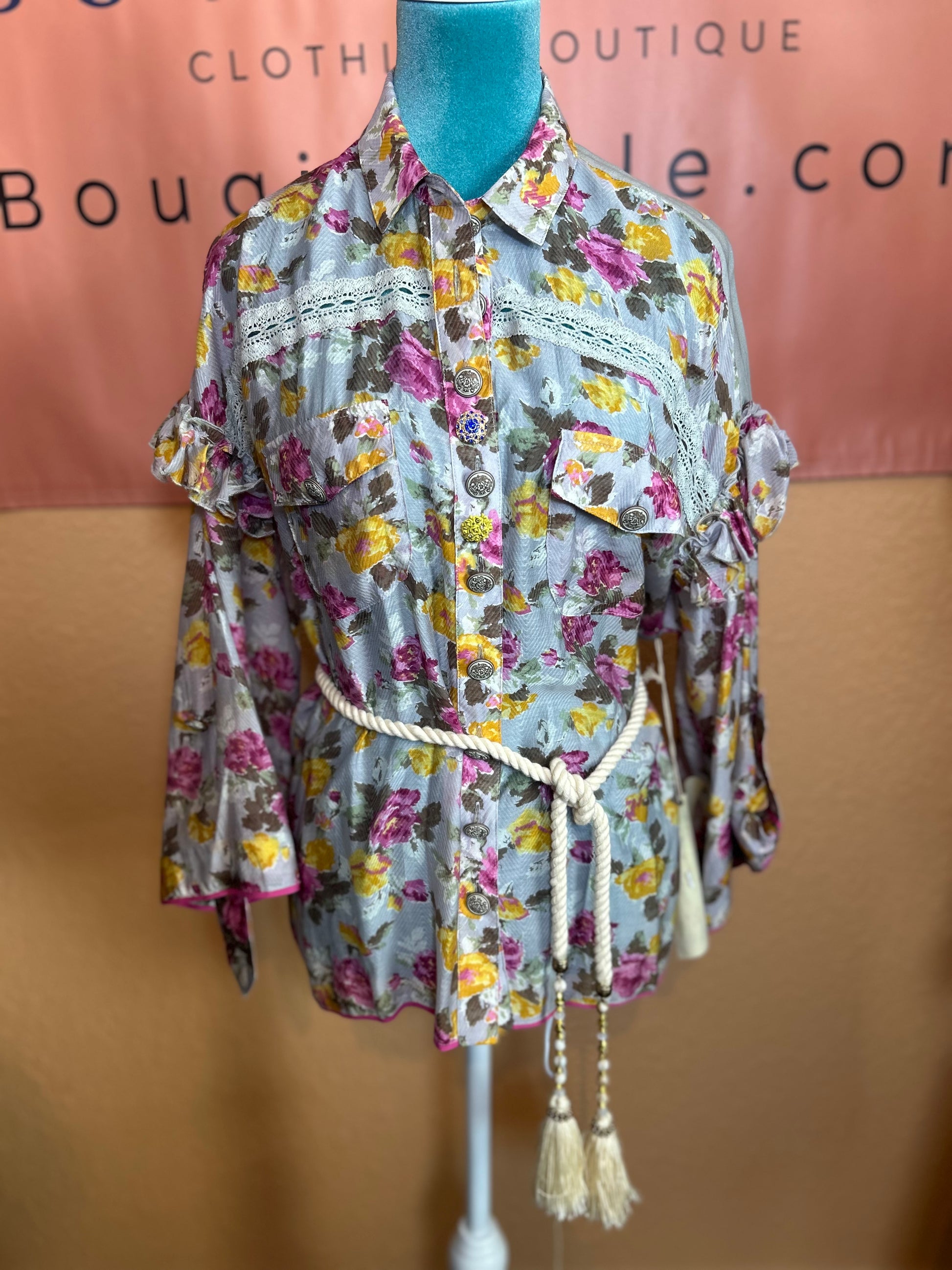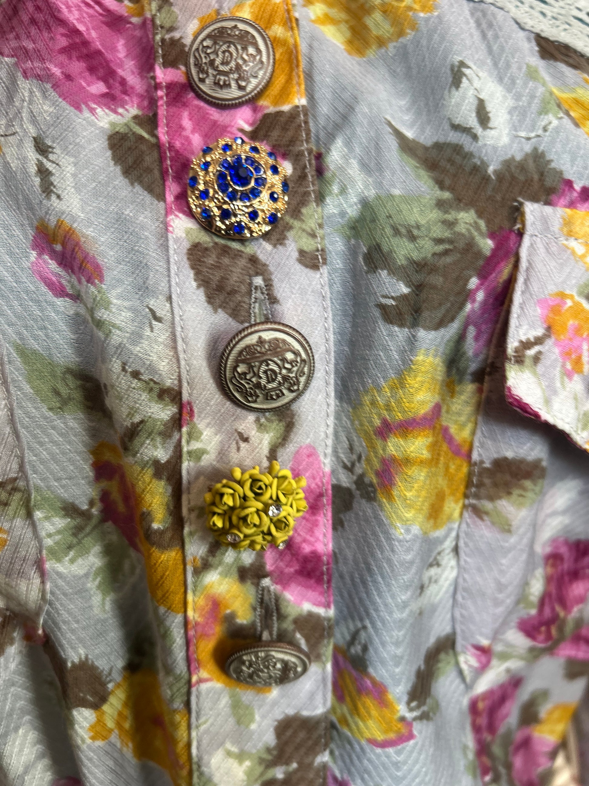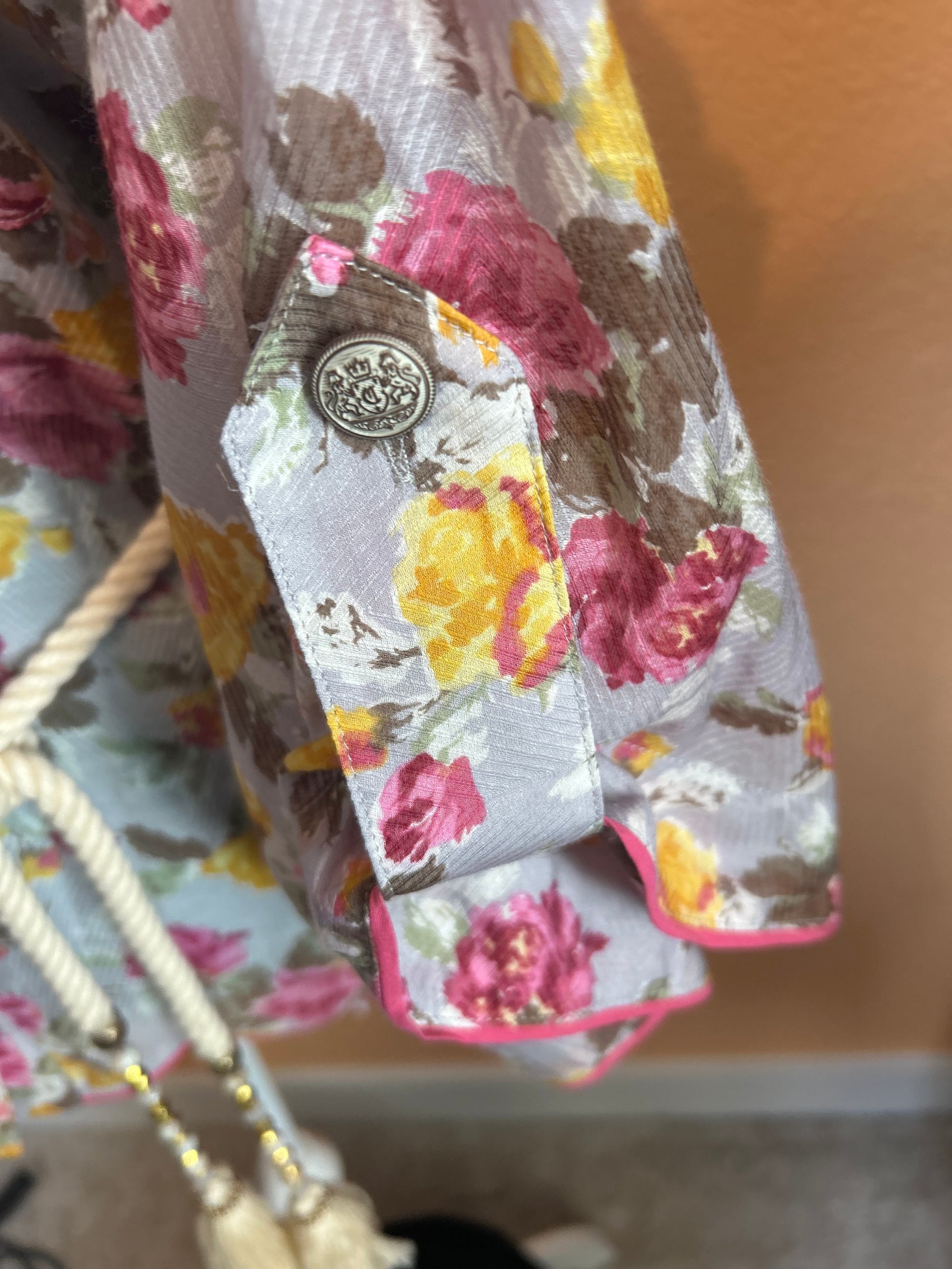 Pink and yellow floral, button-down shirt with gray background. Special details of rope tie with tassels and jeweled buttons with rhinestones.