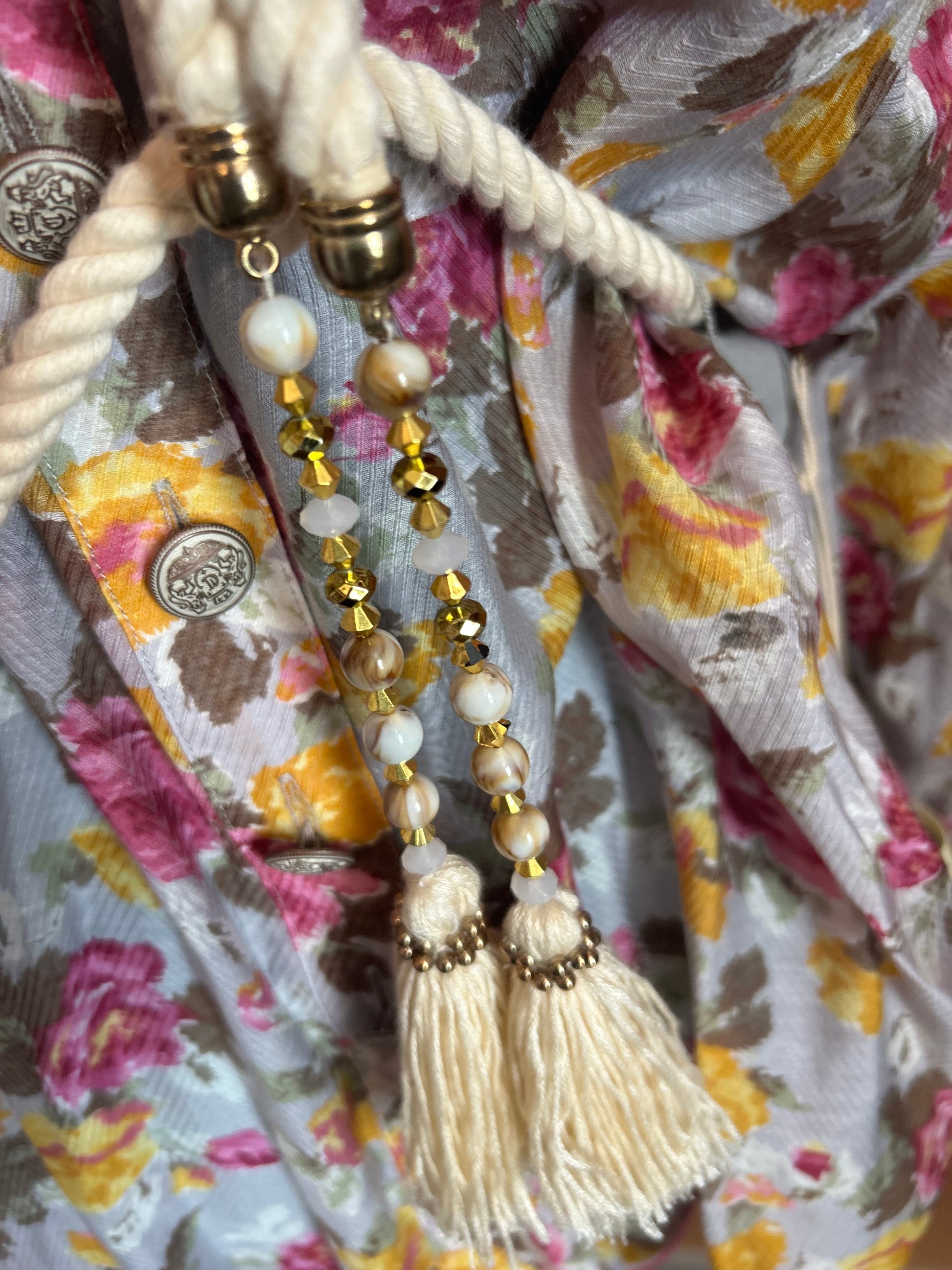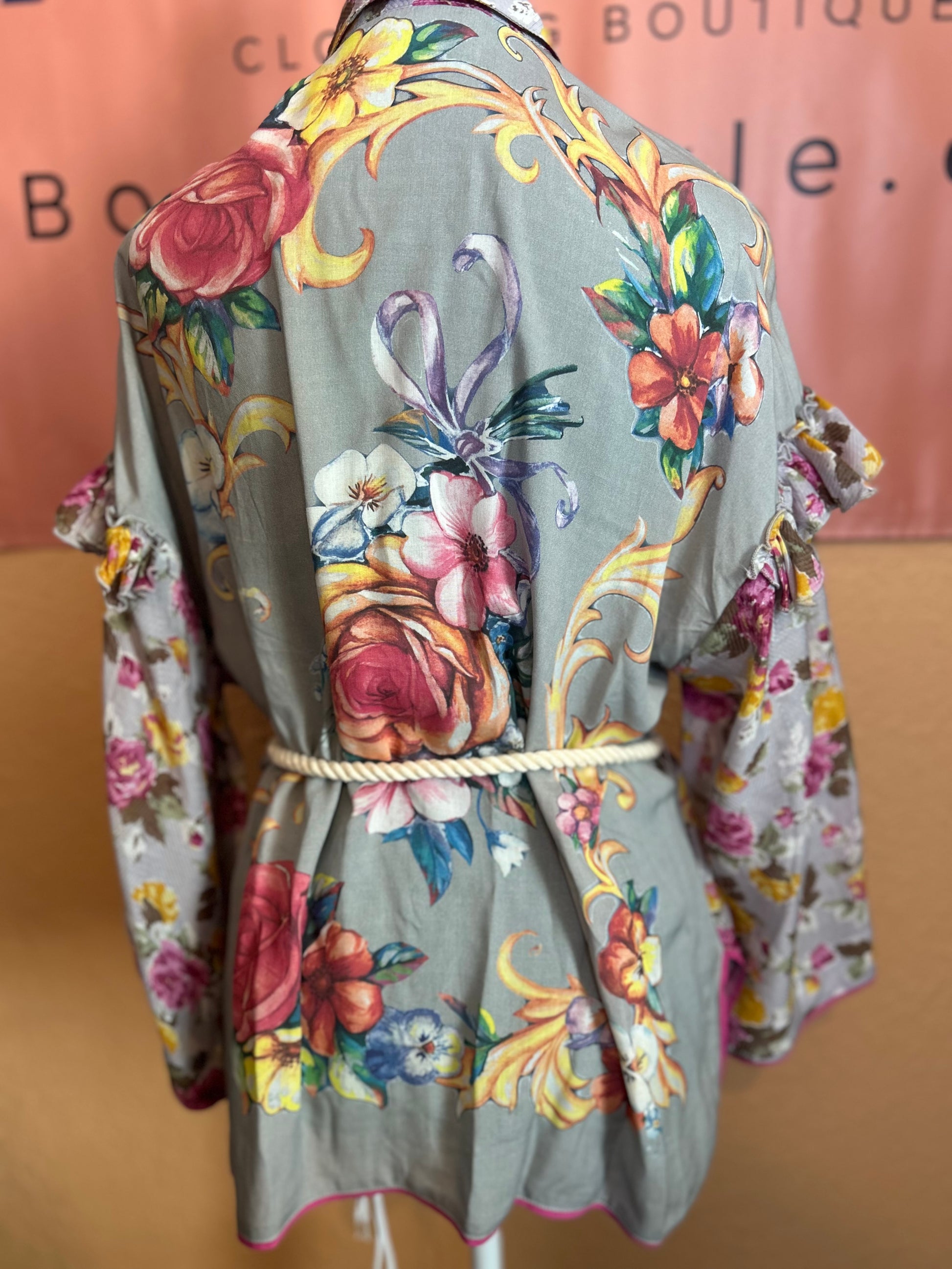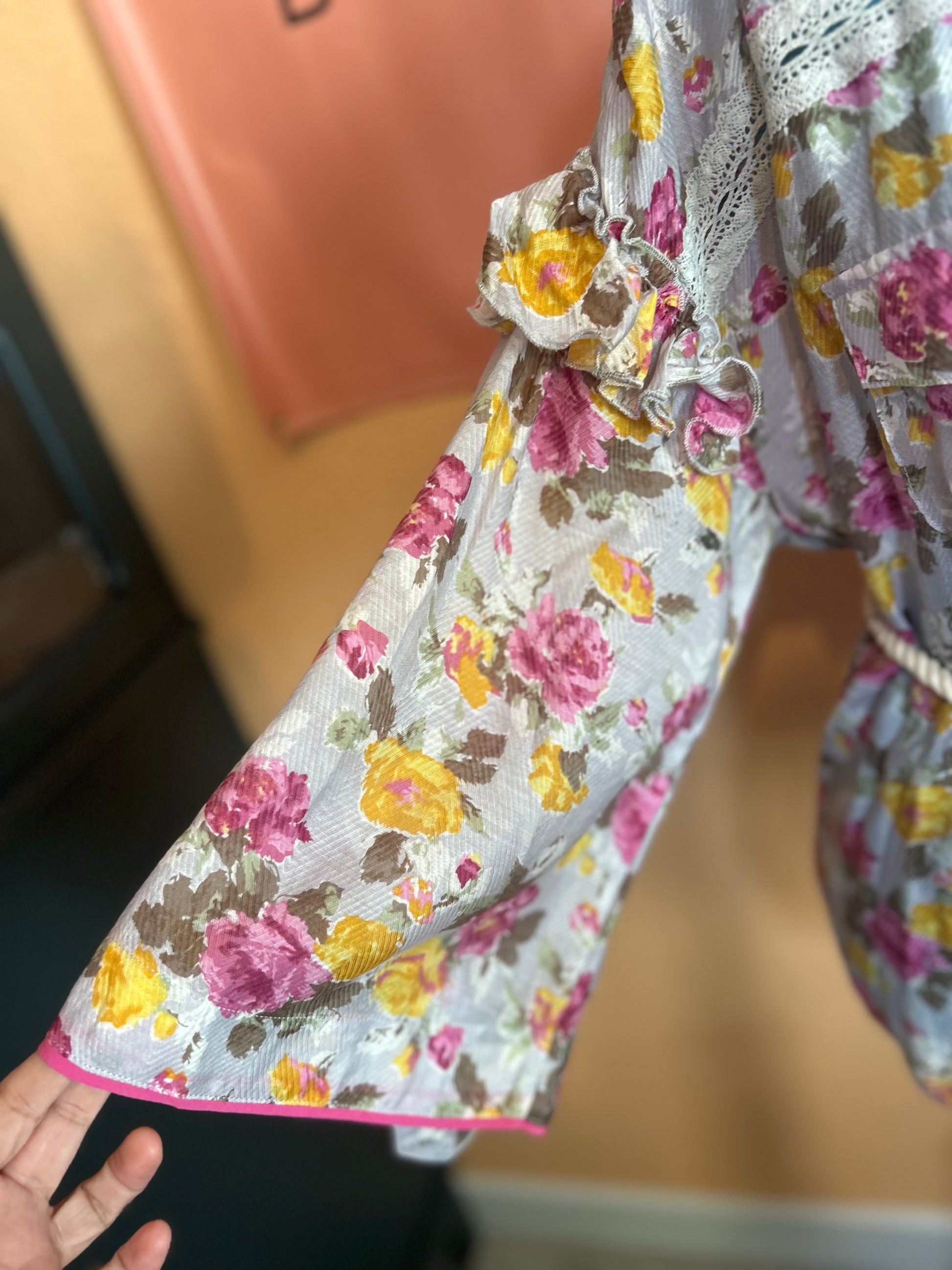 Pink and yellow floral, button-down shirt with gray background. Special details of rope tie with tassels and jeweled buttons with rhinestones.
