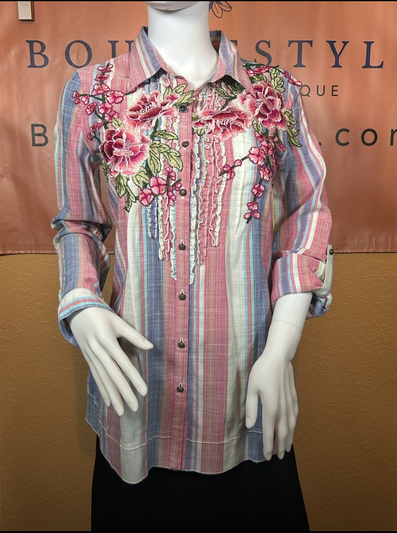 Striped Button Down Shirt with Floral Embroidery on chest and floral back with embroidery, button embellishment.