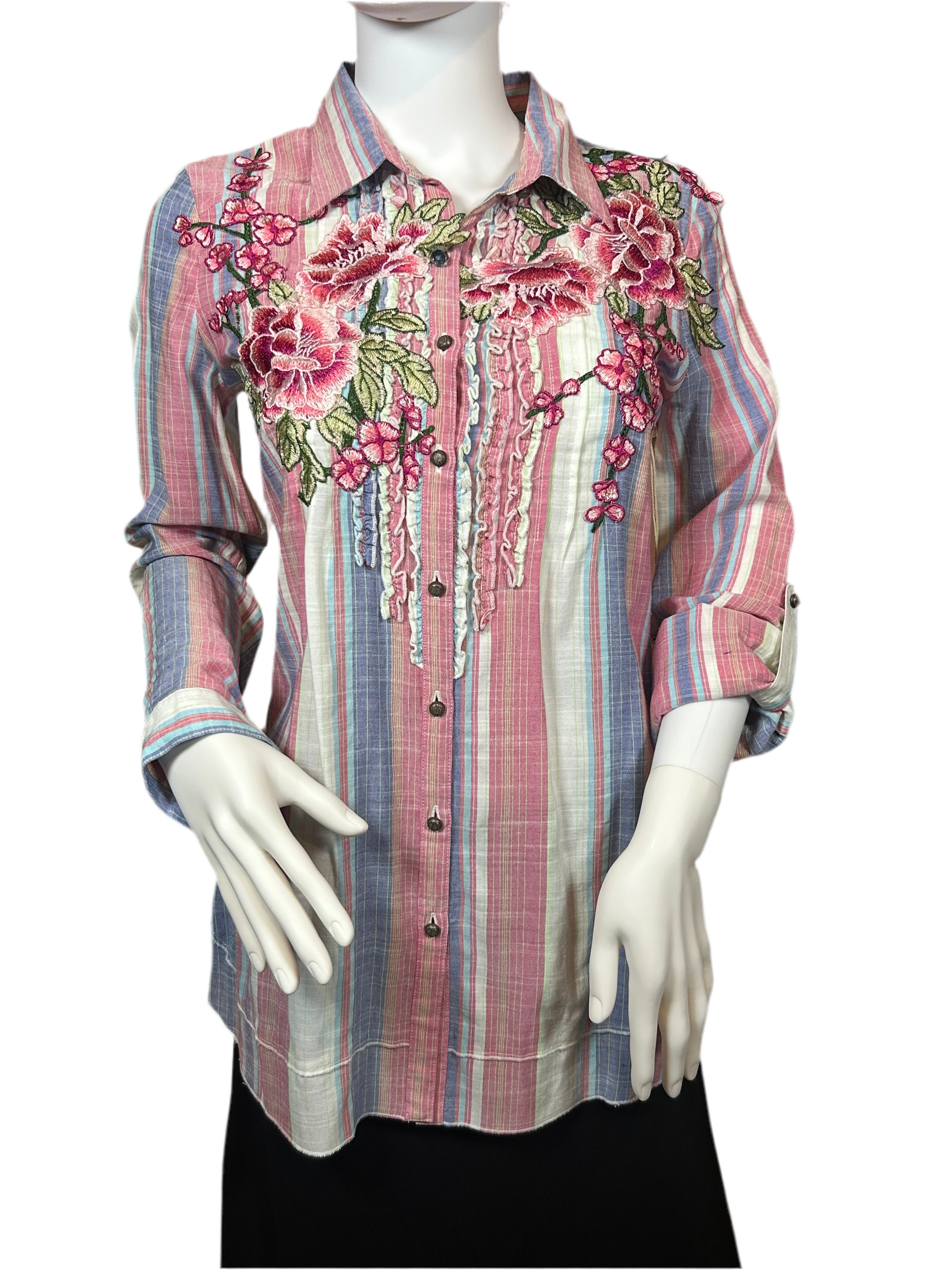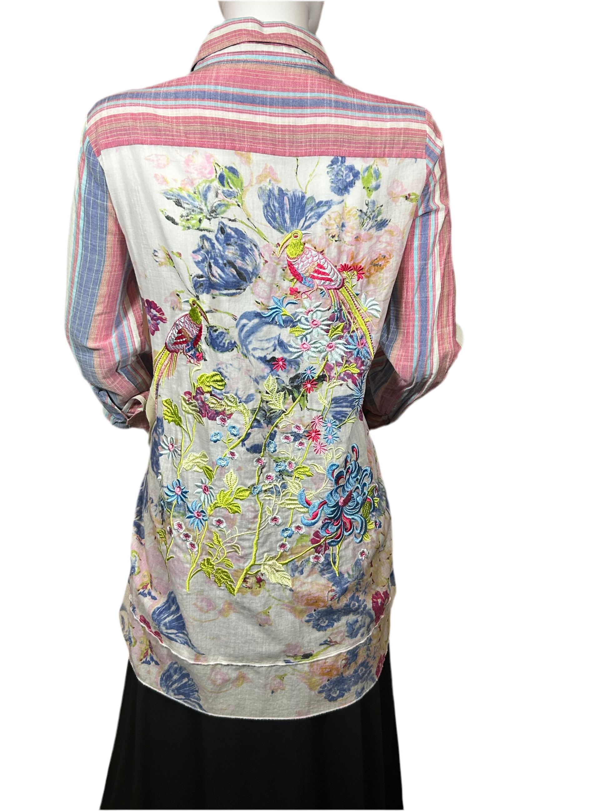 Aratta Striped Embroidered Long Sleeve Shirt with Embellishment