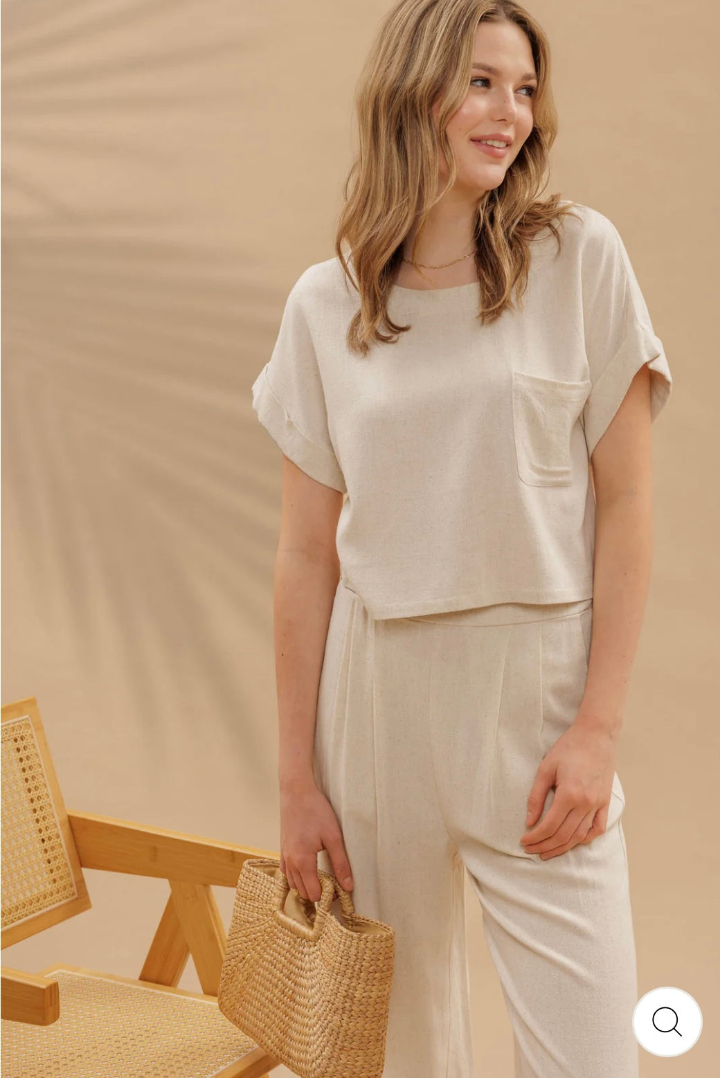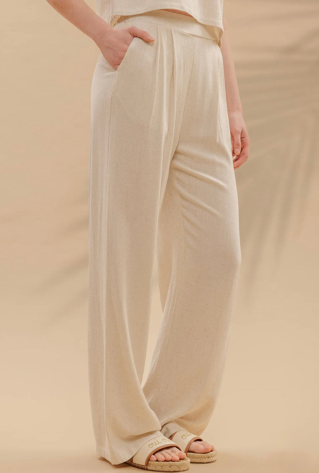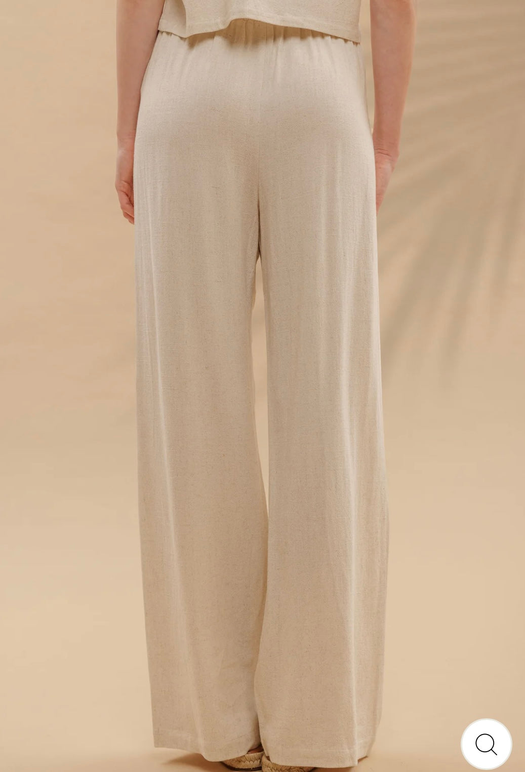 HIGH WAIST ELASTISIZED BACK BAND POCKETS PLEATED WIDE LEG SOLID LINEN BLEND LINED SHELL: 80%RAYON, 20%LINEN LINING: 65%POLYESTER, 35%COTTON