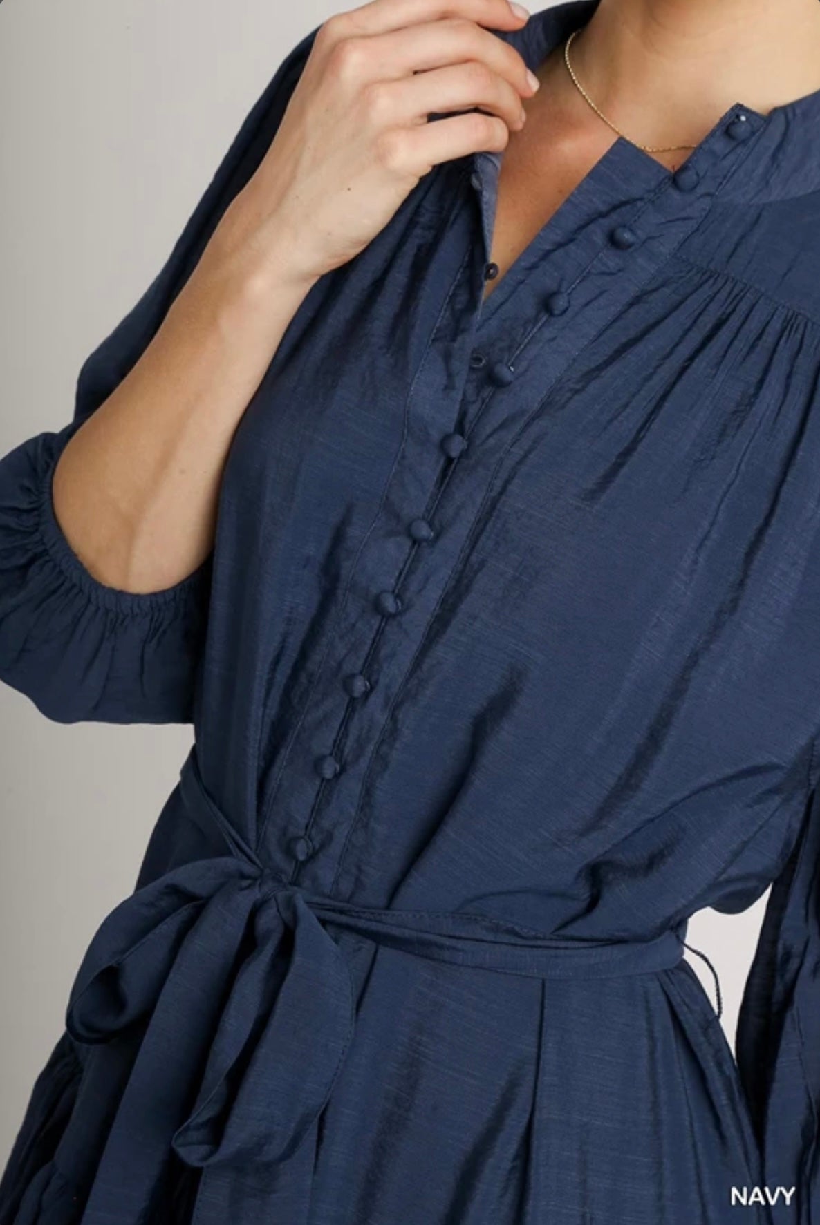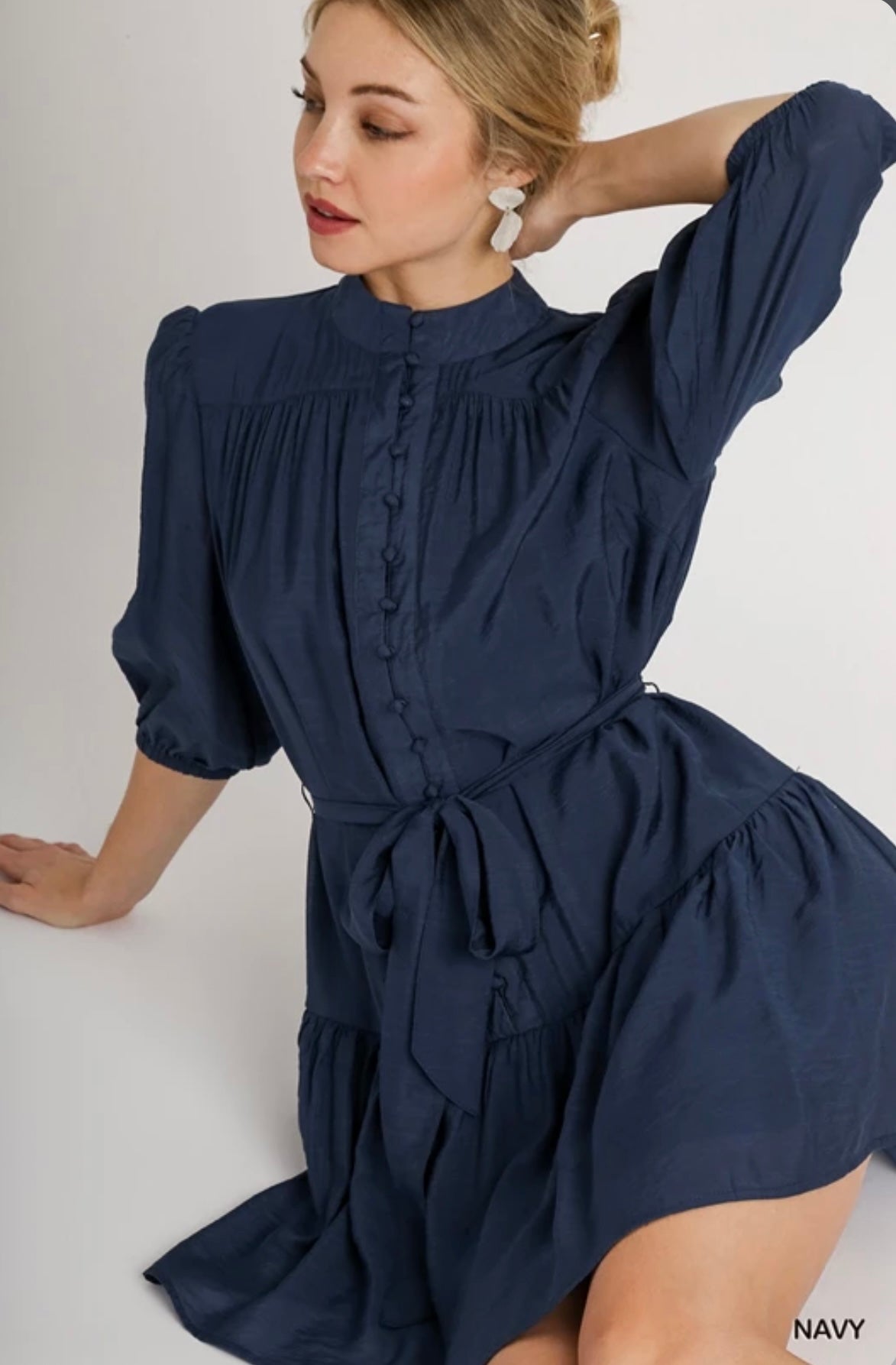 C3633 Mandarin Collar Fabric Button Down Dress with Short Puff Sleeves & Front Tie Belt