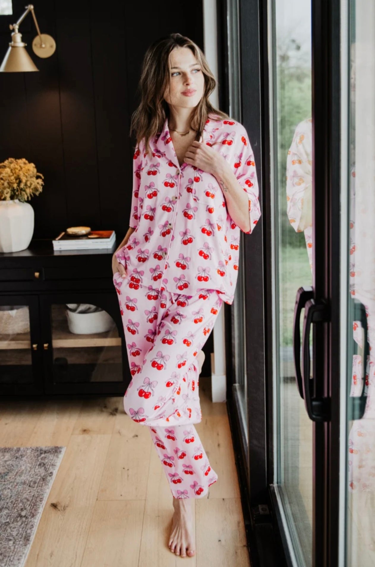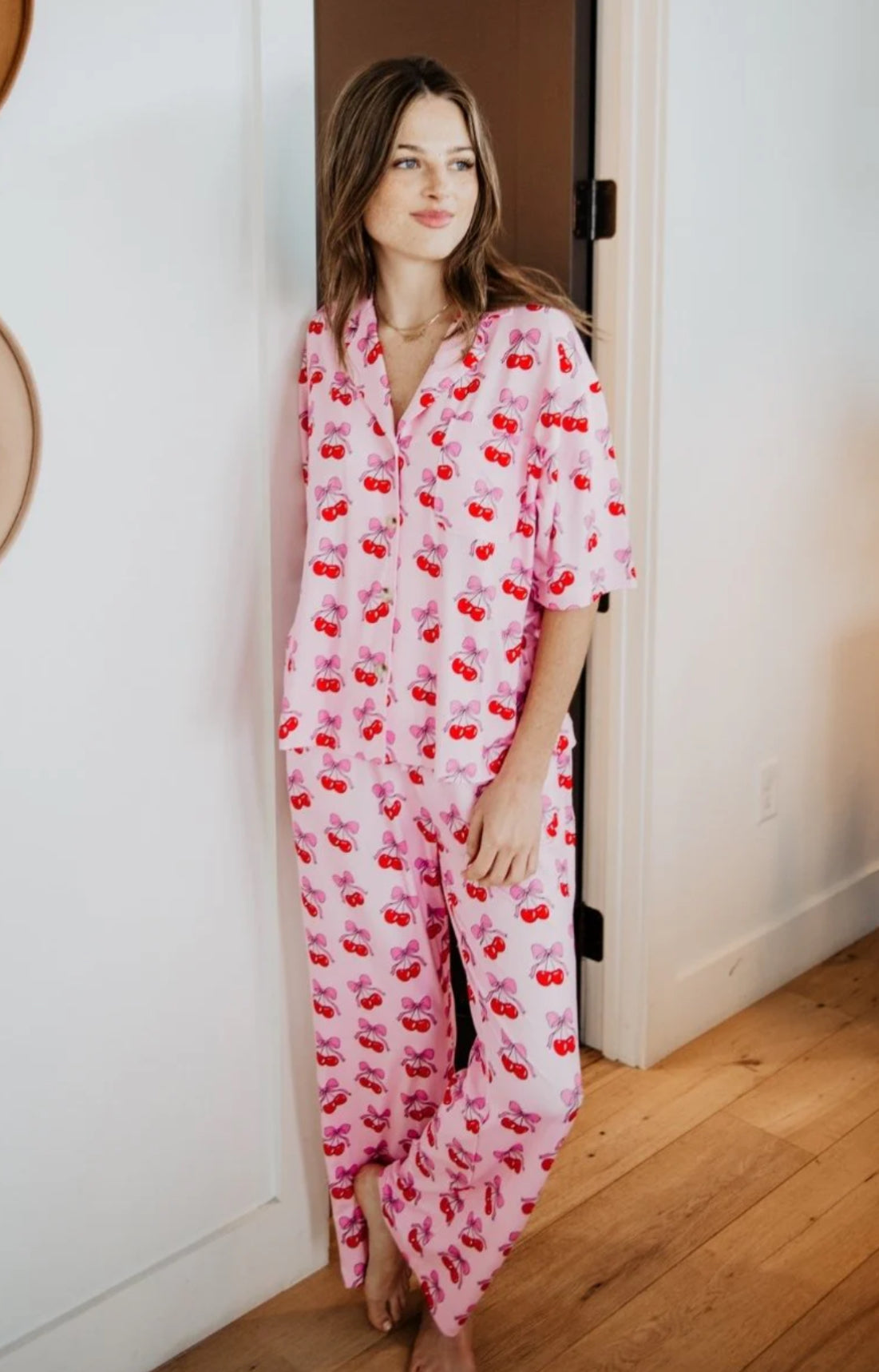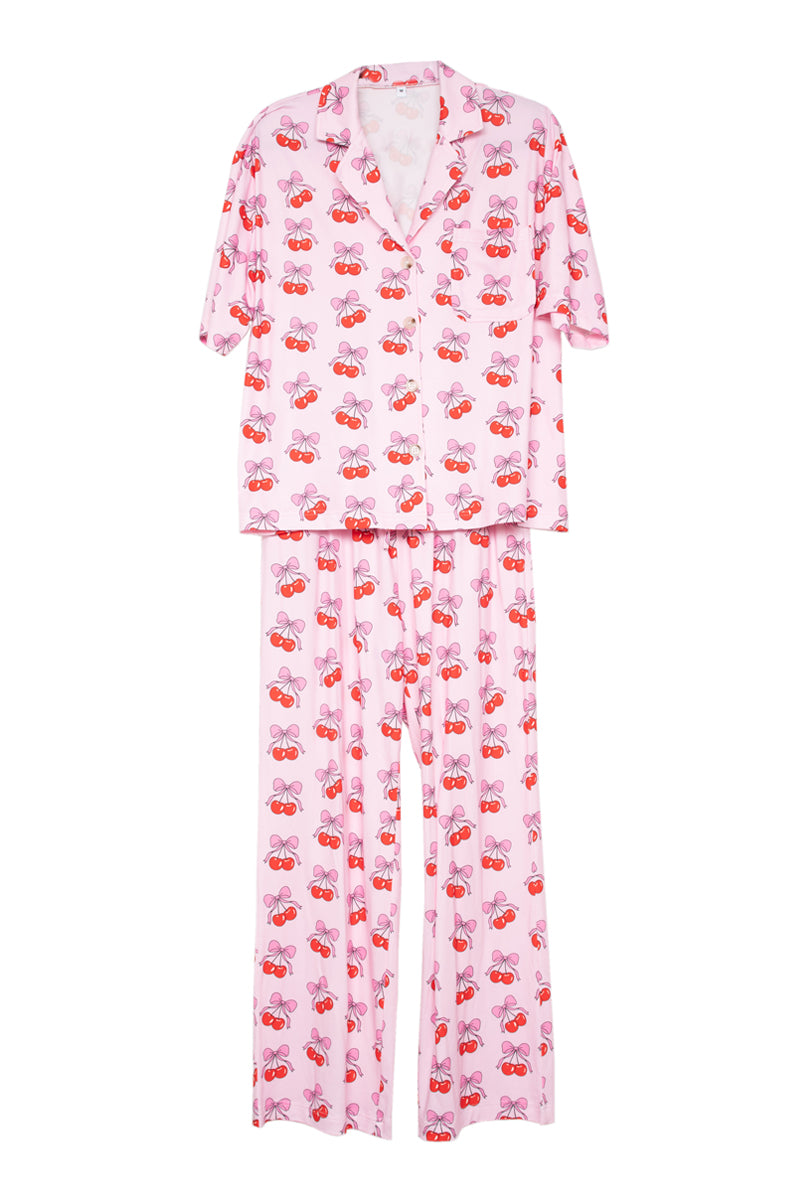 This pajama pant set is bursting with fruity flair and feminine vibes. Covered in a playful cherry bow print, the button-front top and matching pants with an elastic waistband create the ultimate coquette-inspired sleep set. And yes, these cherry bow pajamas come with pockets—because cuteness should always be convenient.