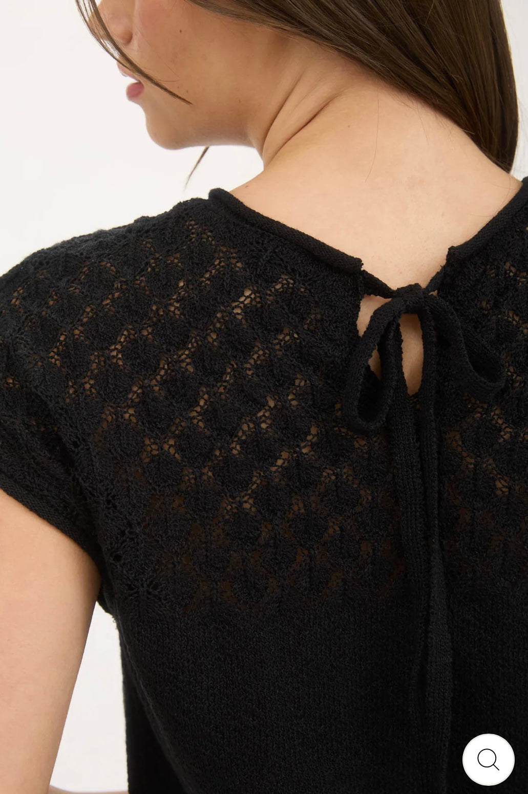 ROUND ROLL NECK BACK SELF TIE SHORT SLEEVES DROP SHOULDER EYELET YOKE SWEATER KNIT TOP 100% POLYESTER
