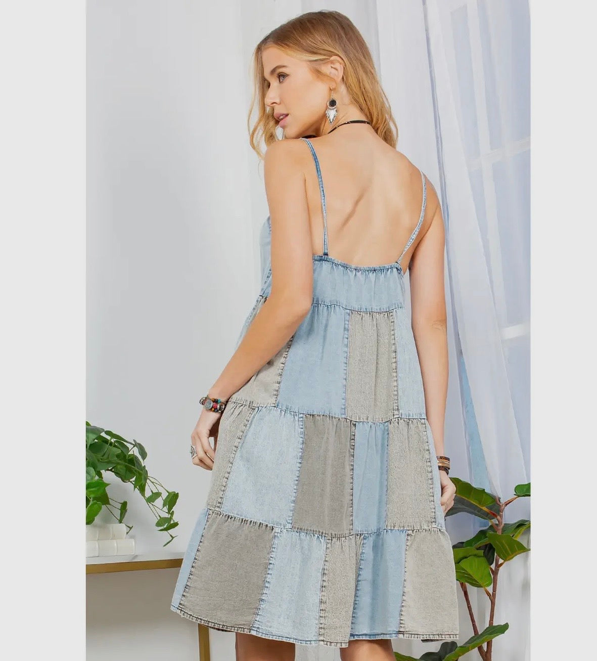 Retro Vibes, Modern Edge: A 60s-inspired denim patchwork dress that radiates playful nostalgia and style.