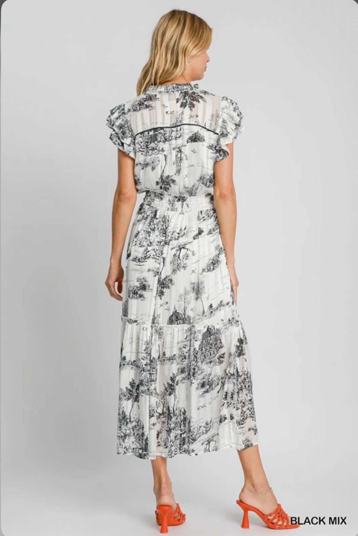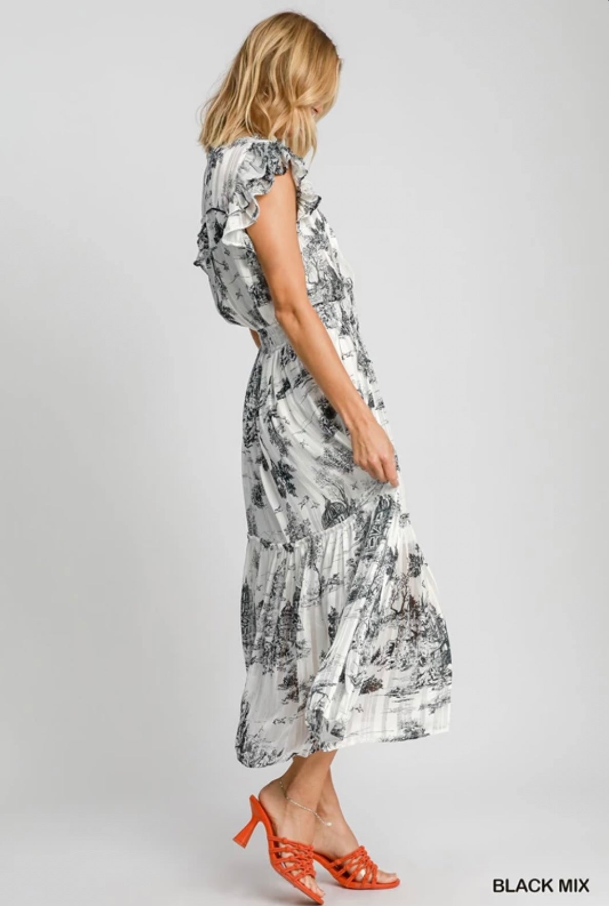 K9274 Two Tone Landscape Print Midi Dress