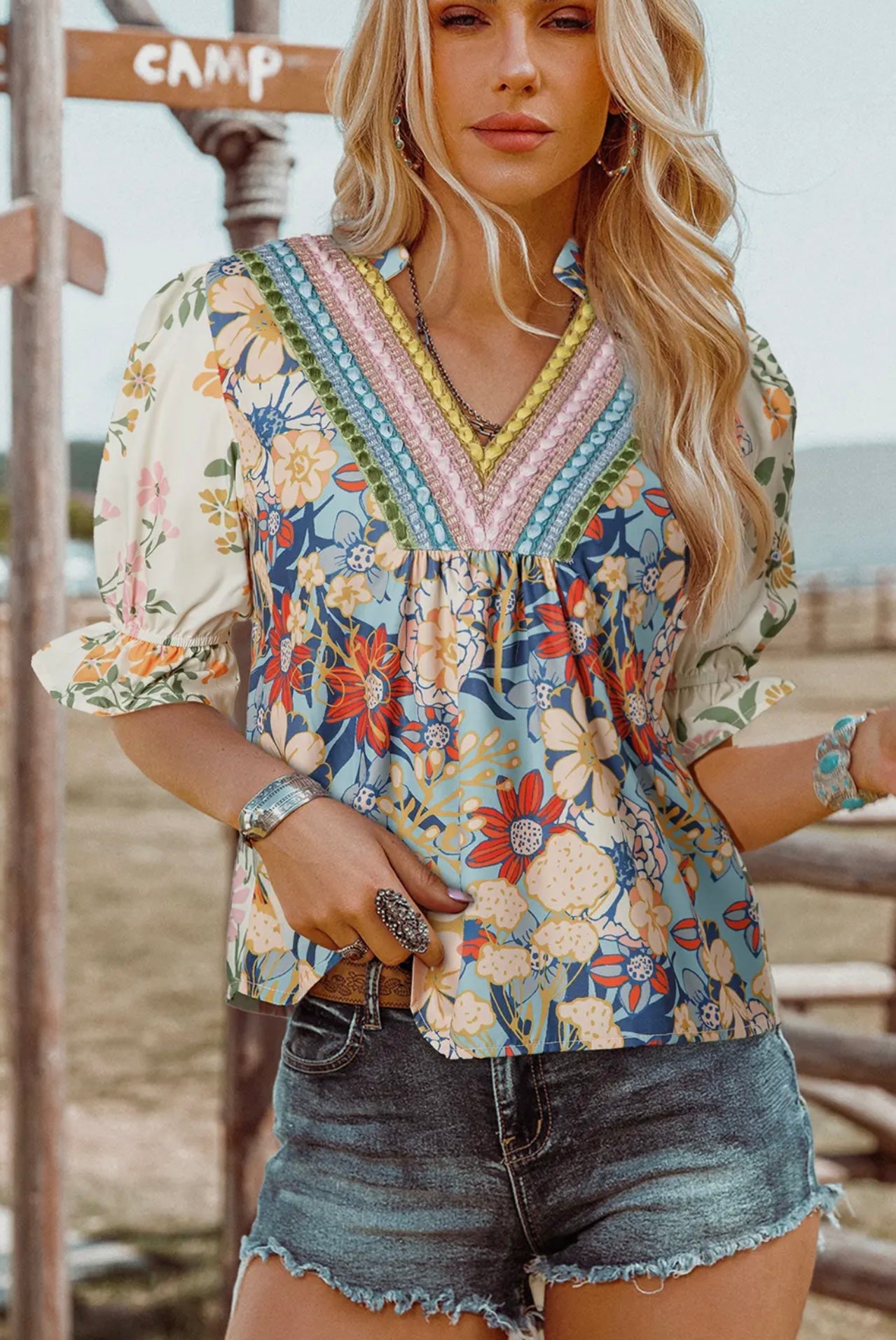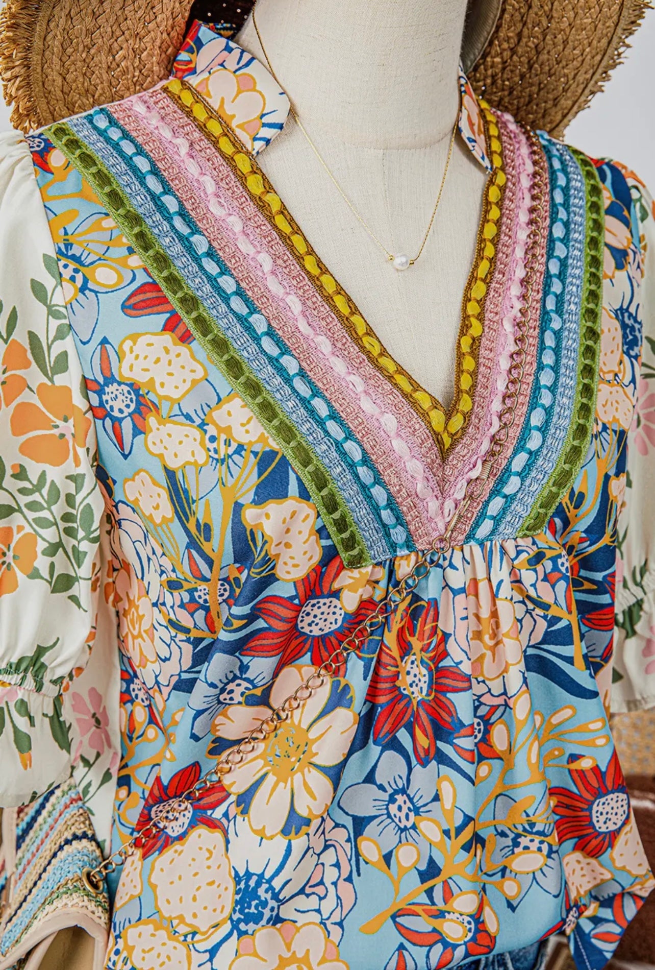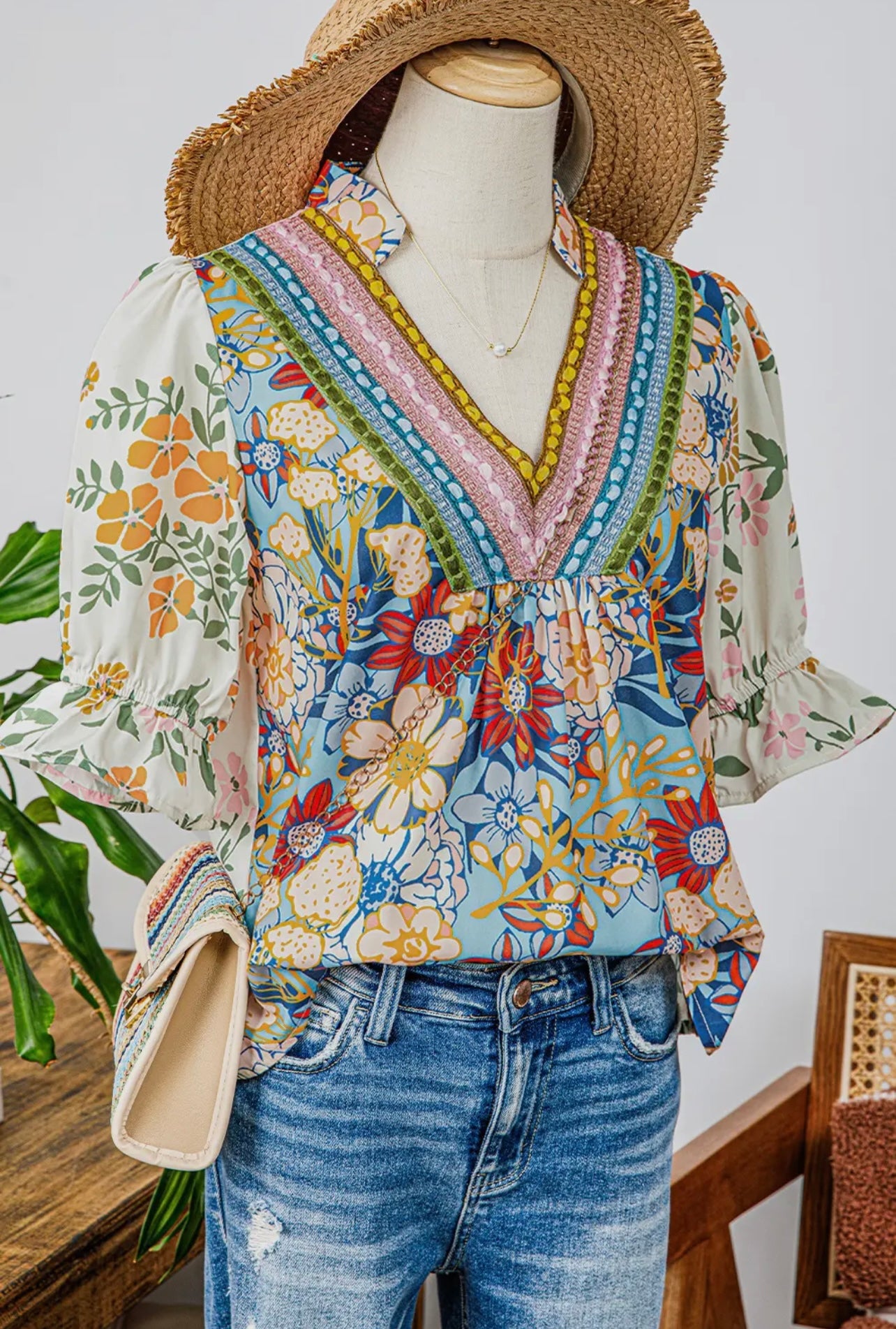 V-neck Floral pattern shirt with yarn embroidery around V-neck.