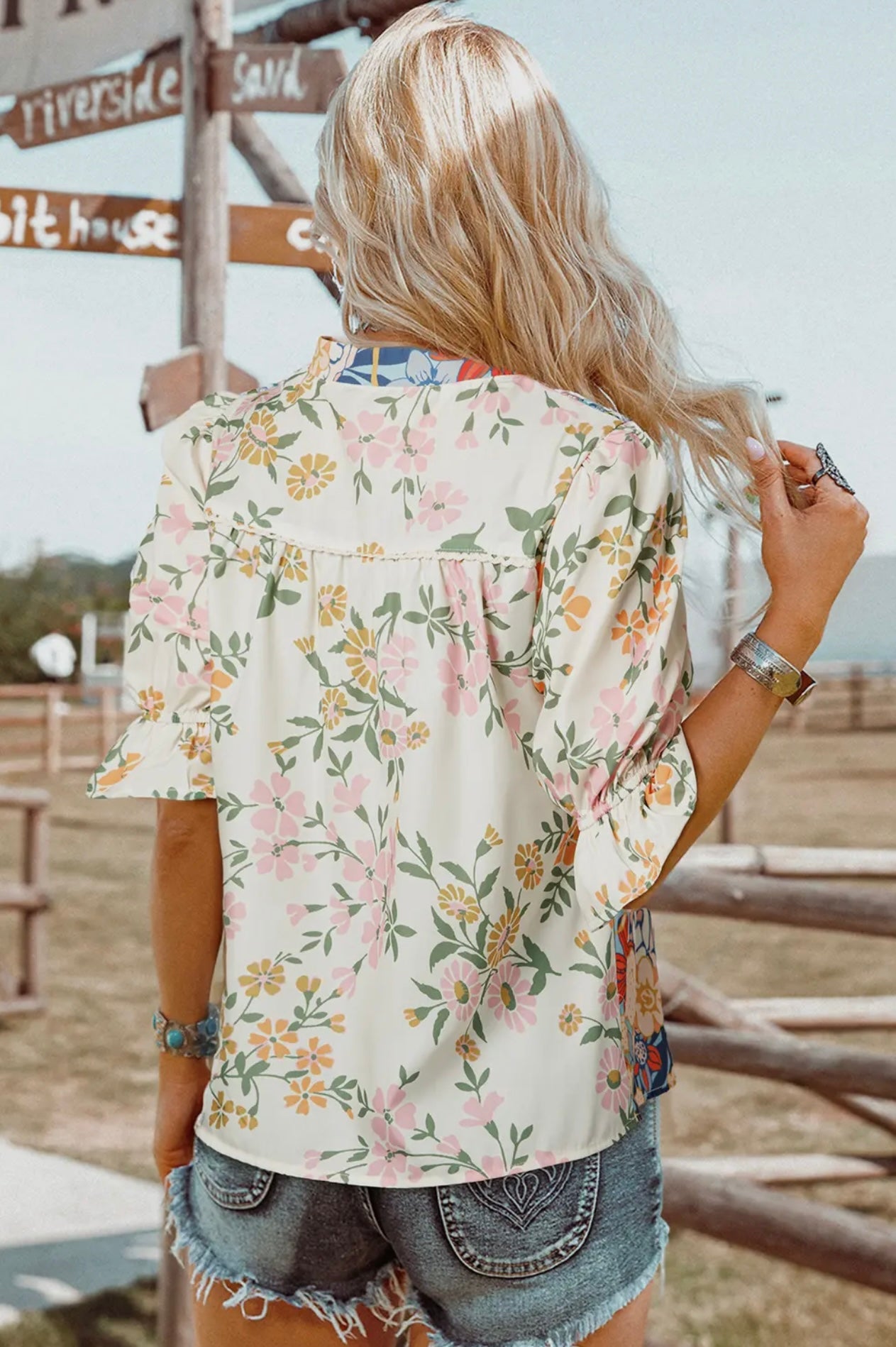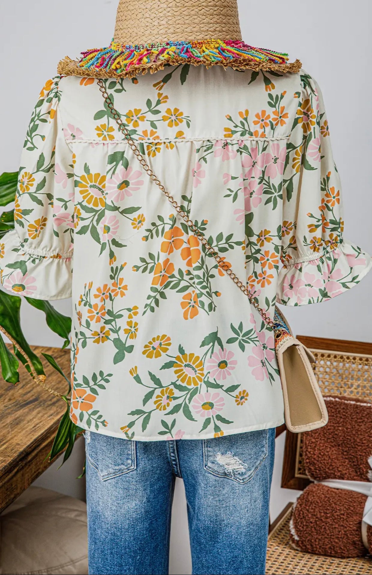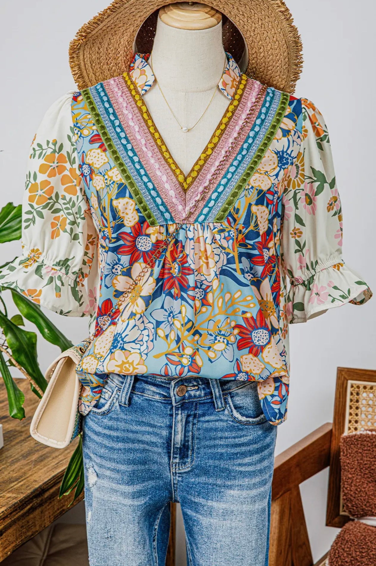 V-neck Floral pattern shirt with yarn embroidery around V-neck.