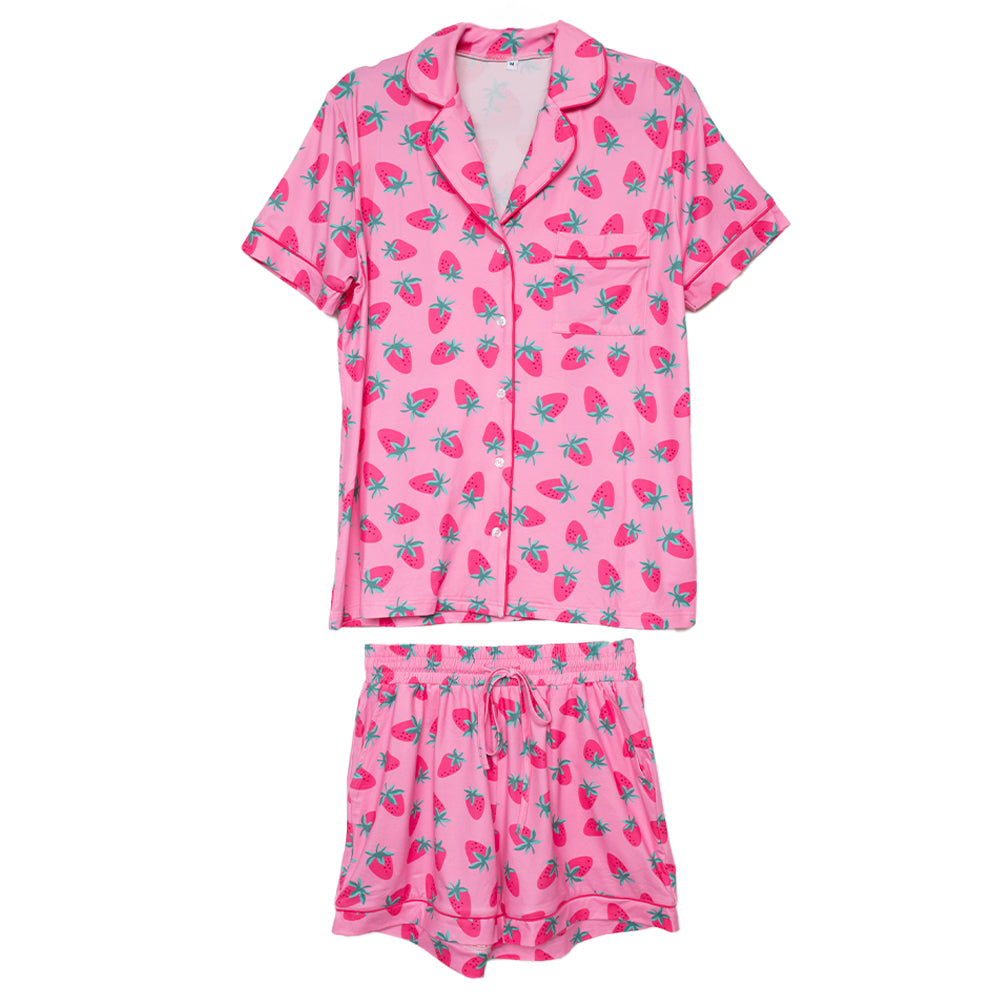Get ready for sweet dreams with our Pink Strawberry Print Pajama Set for Women! This adorable set features a playful strawberry print on a soft pink background, bringing a touch of fun and whimsy to your nighttime routine. Made with lightweight, breathable fabric, these pajamas are perfect for staying cozy without overheating. The relaxed fit and elastic waistband ensure maximum comfort, making them a must-have for lounging or catching some Zzzs.