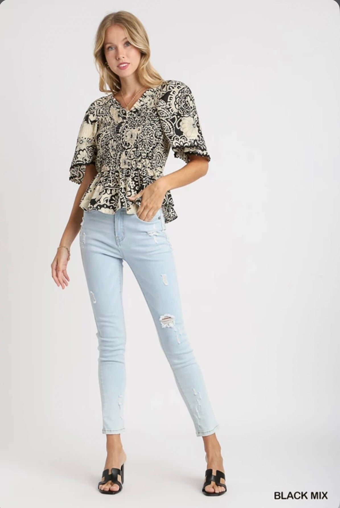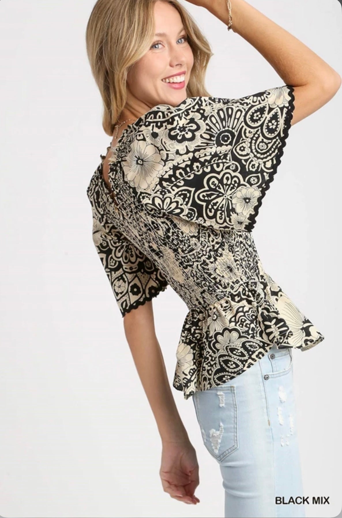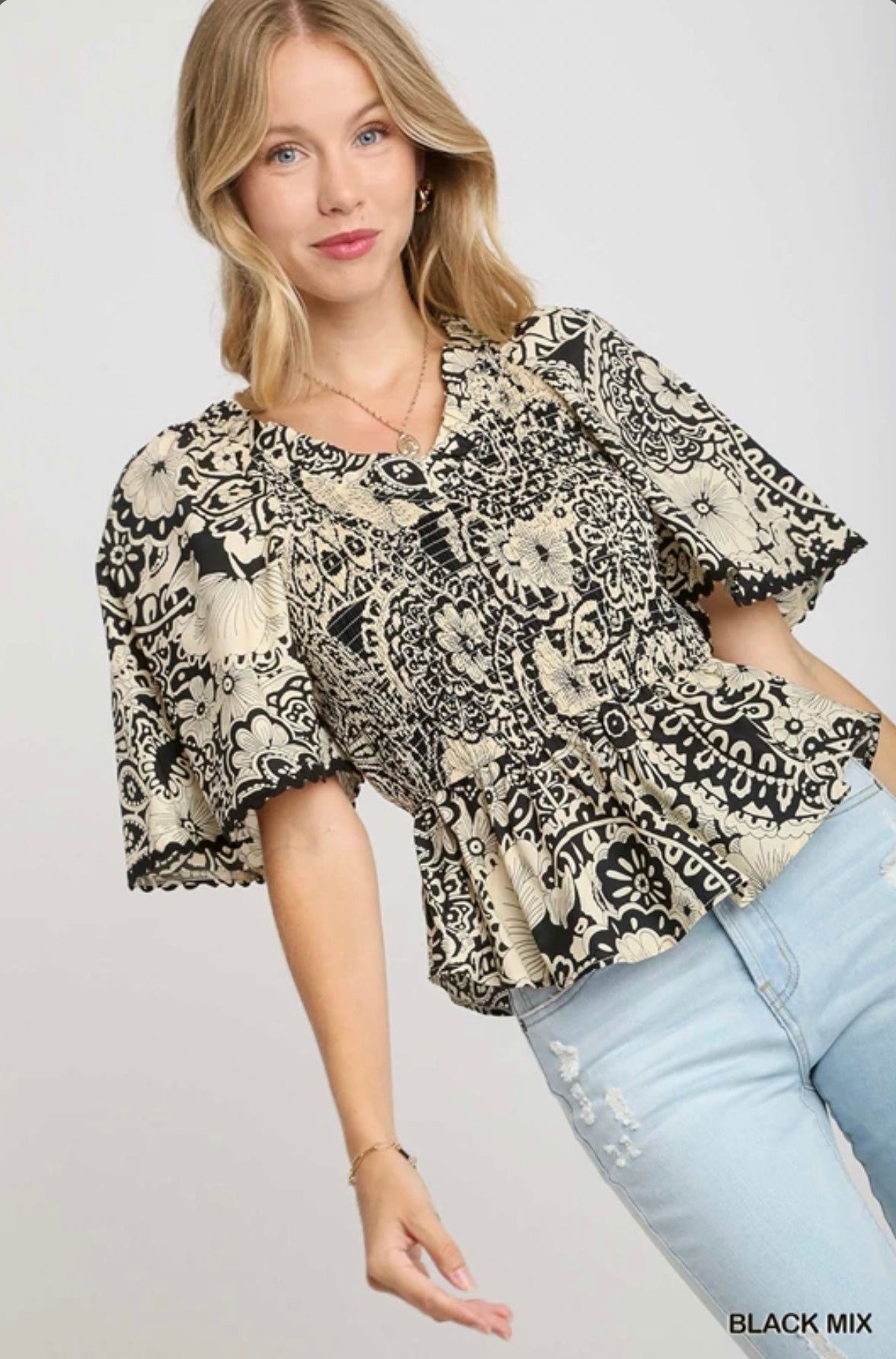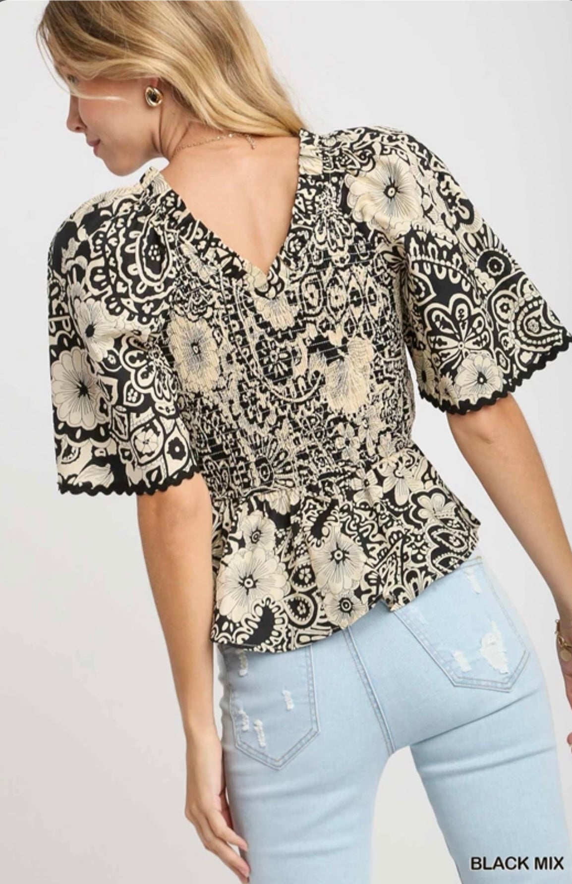 R0683 Two Tone Paisley Print Top- Black Mix