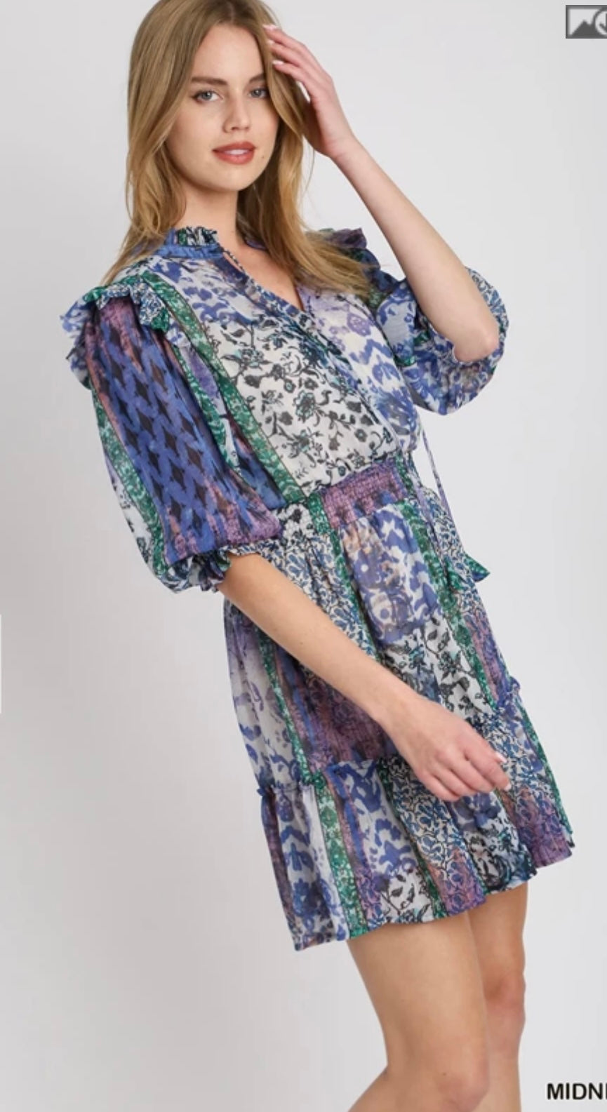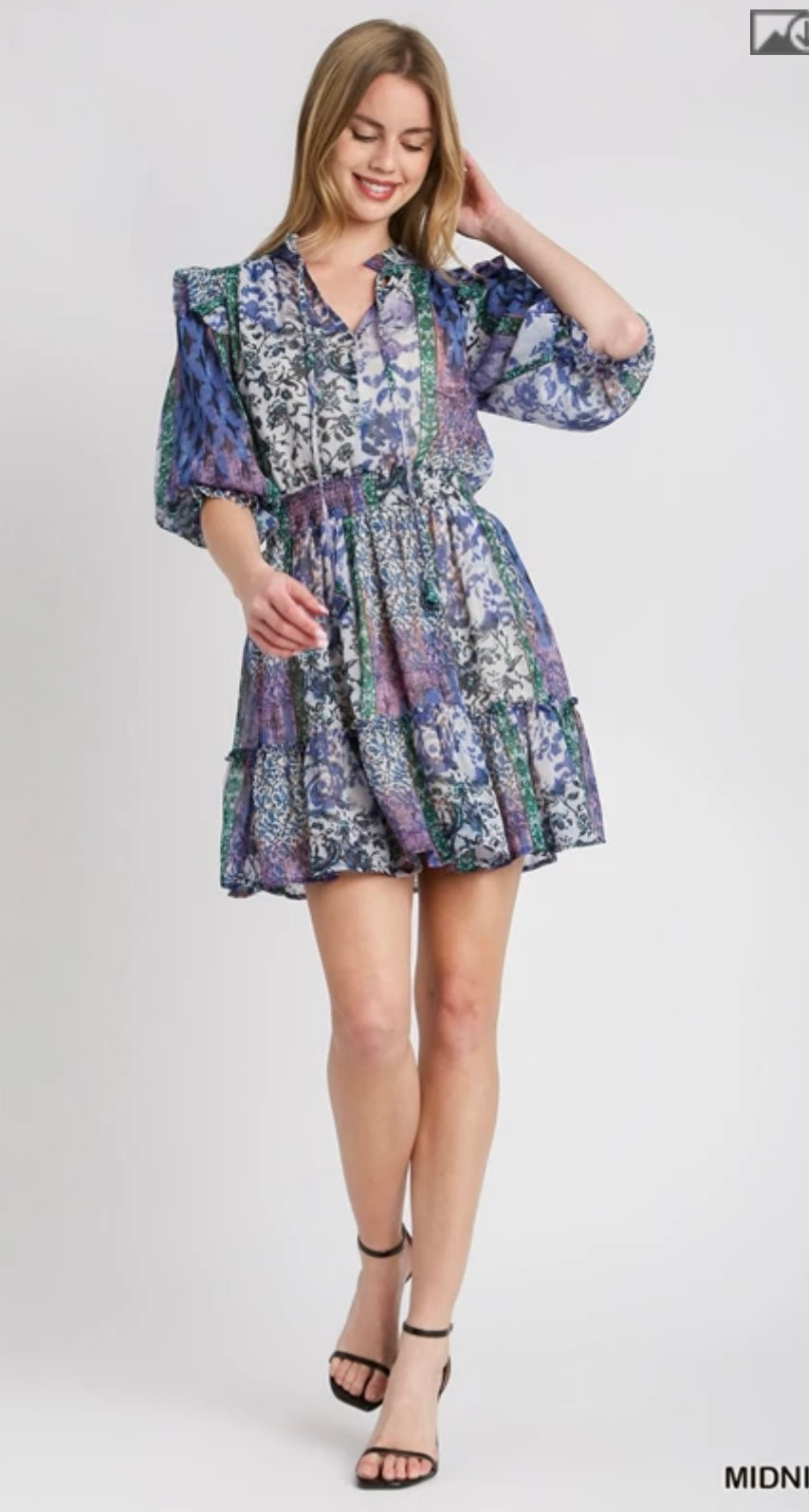 Mixed Print Ruffle Neckline with Front Tie Dress with Elastic Smocked Waistband, 3/4 Balloon Sleeve