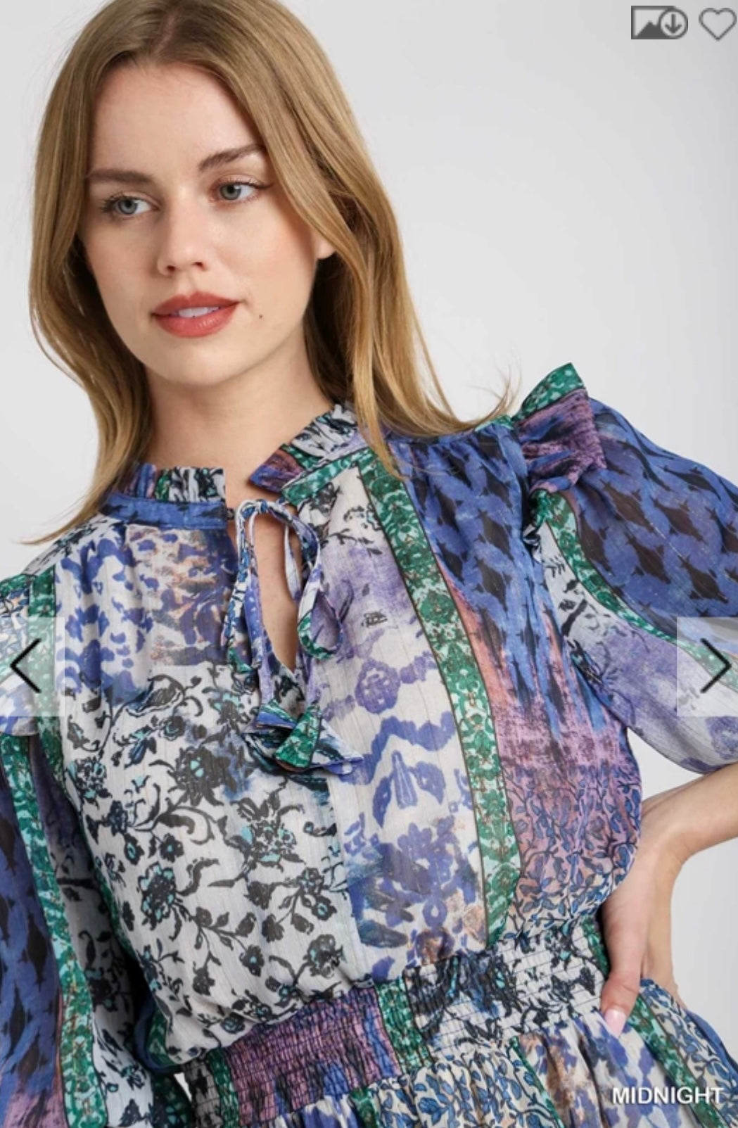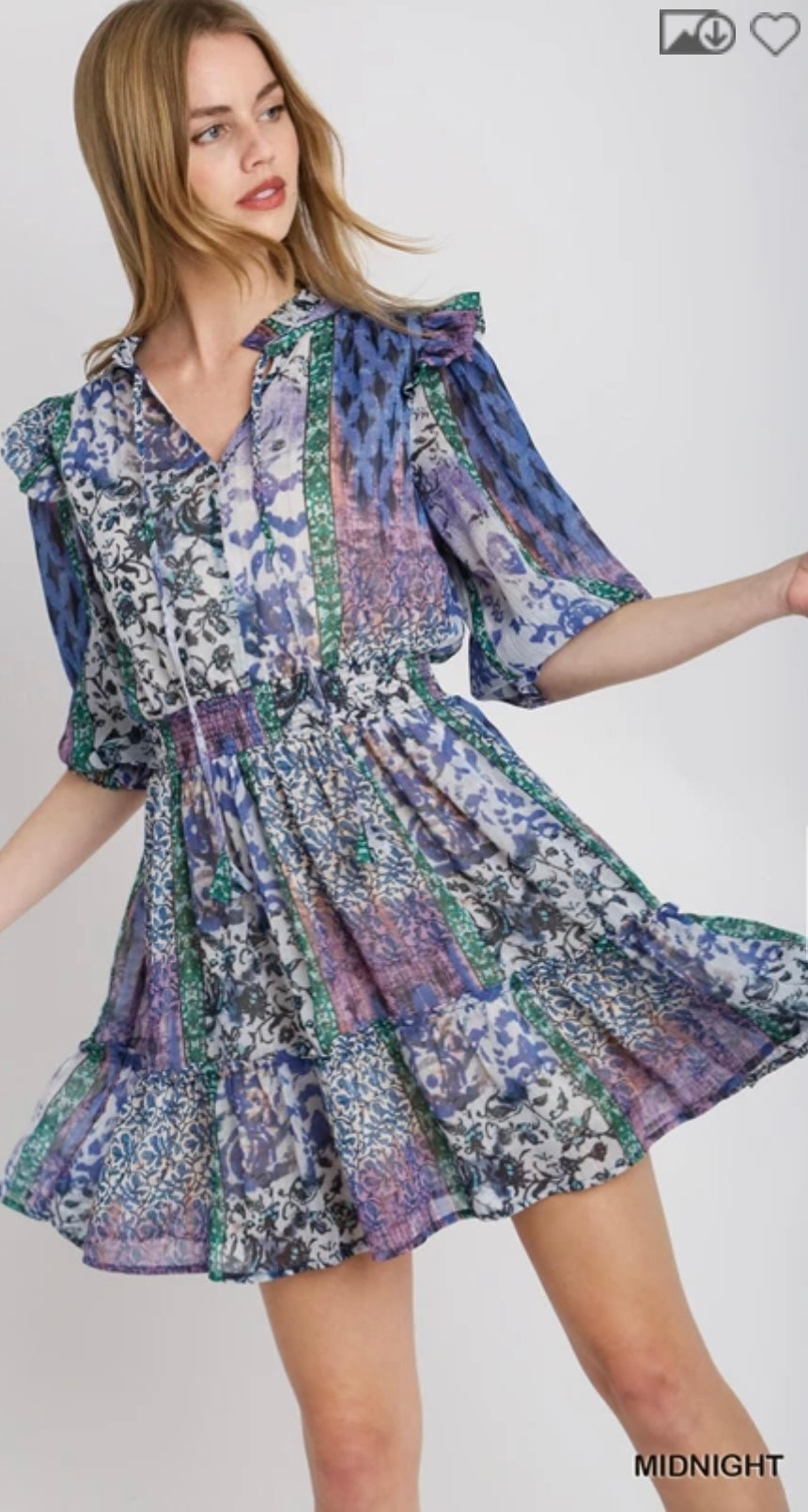 R0832 Mixed Print Ruffle Neckline with Front Tie Dress with Elastic Smocked Waistband