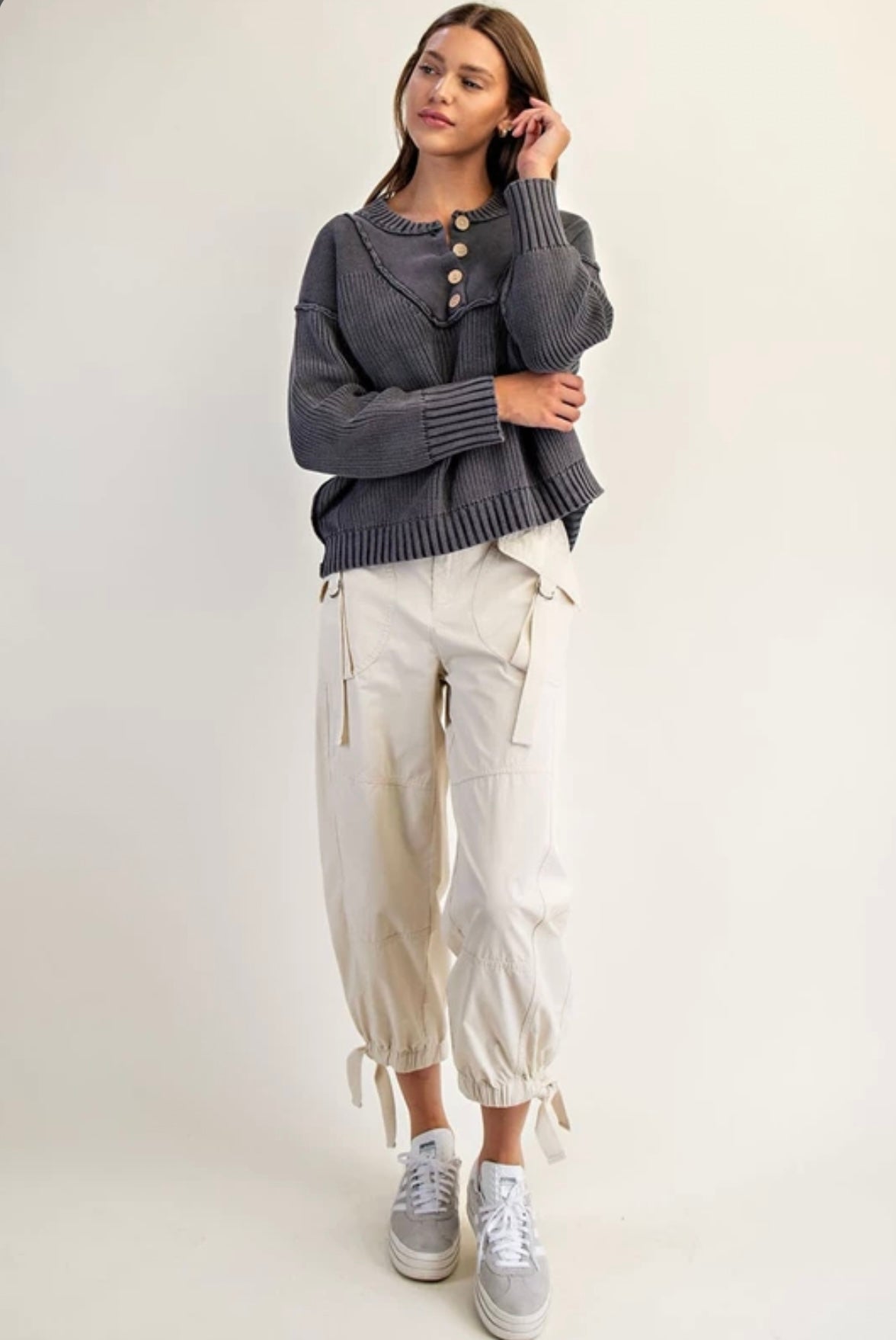 Product Detail: This textured knit sweater features a wide ribbed placket with wooden buttons, contrast knit paneling at the shoulders and collar, dropped shoulders, ribbed detailing at the cuffs and hem, and raw rolled seams for a naturally vintage, worn in feel.