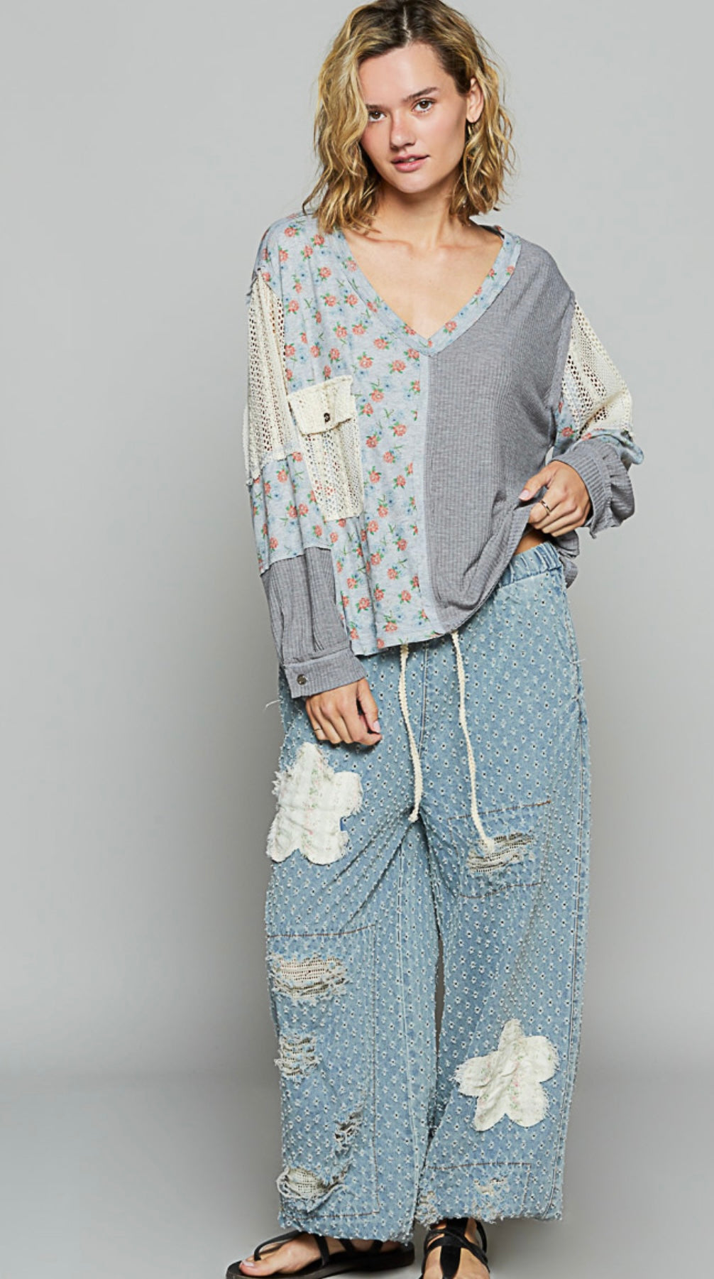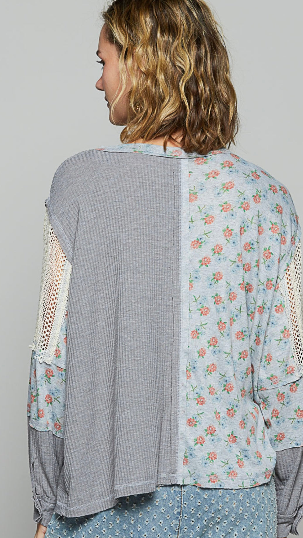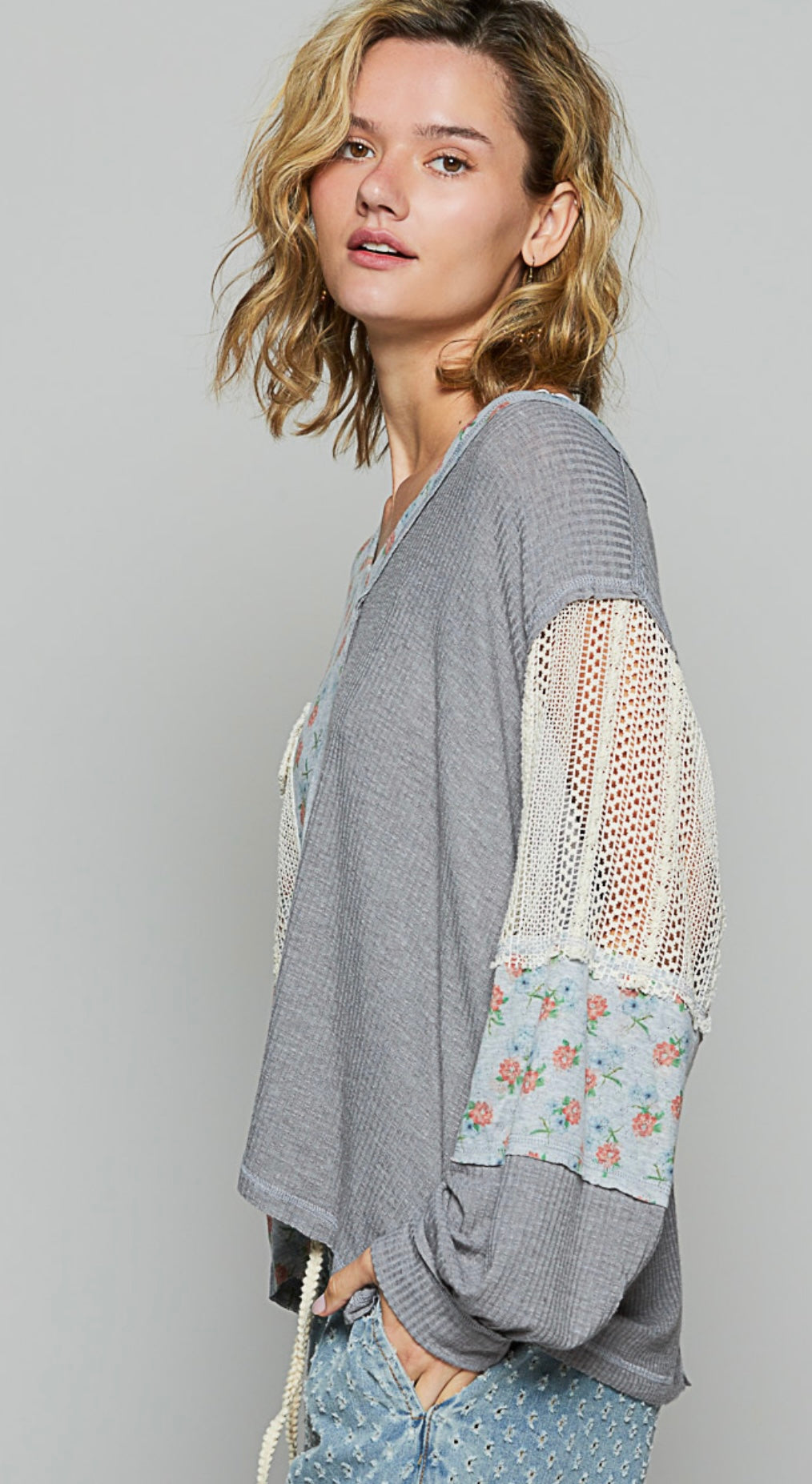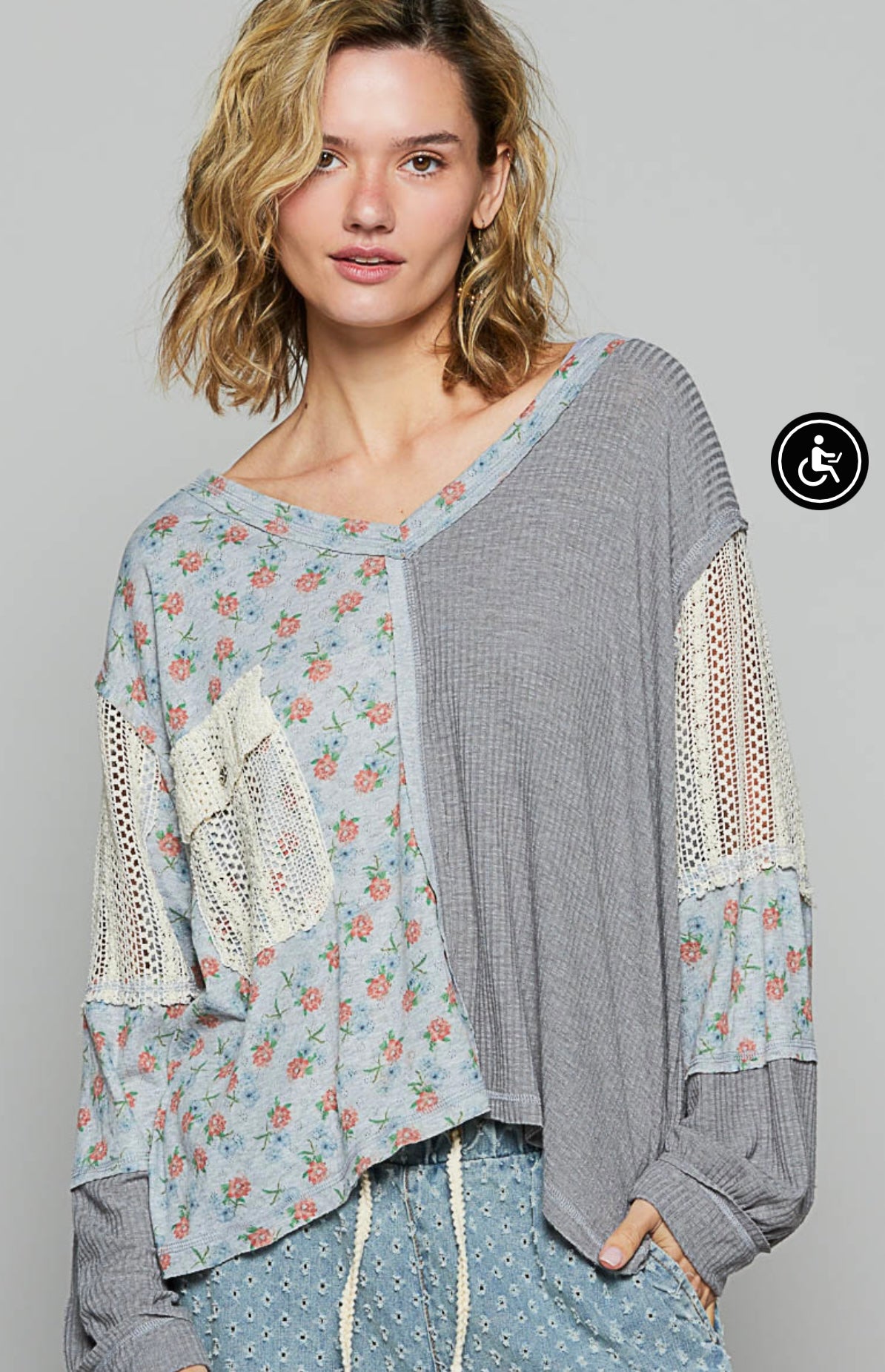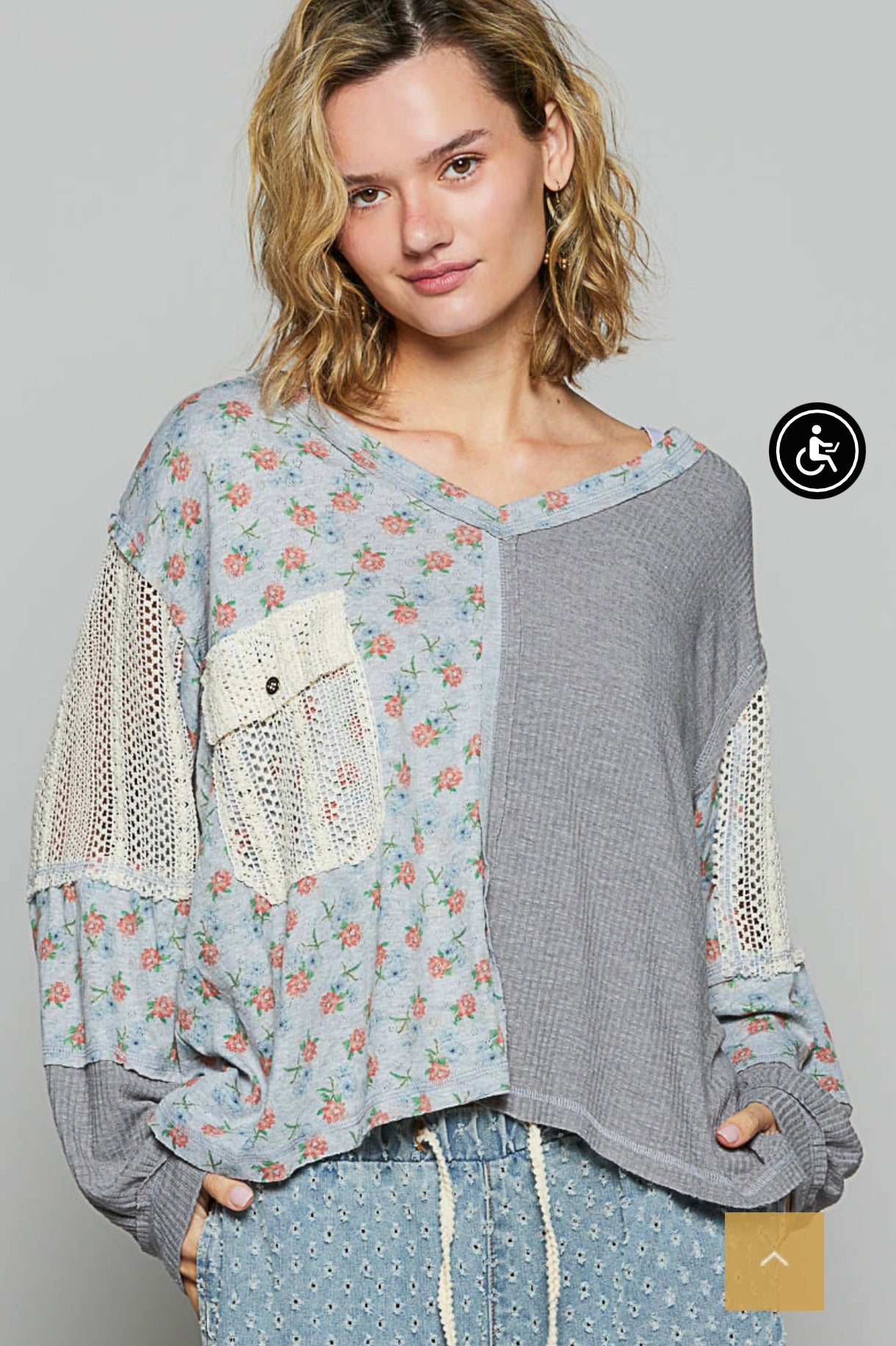 Designed in V-neck long sleeve roomy fit top in ribbed jersey with contrast fabric paneling.