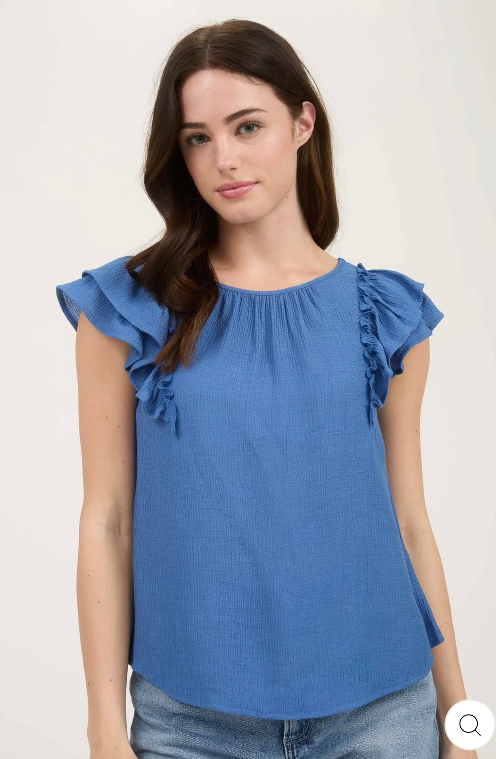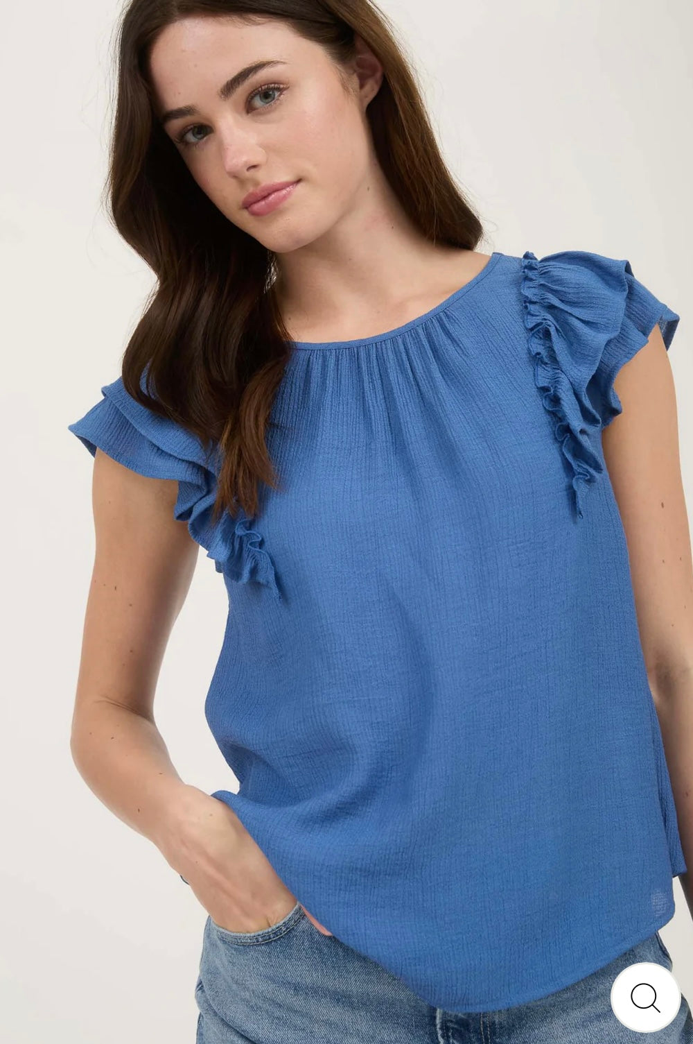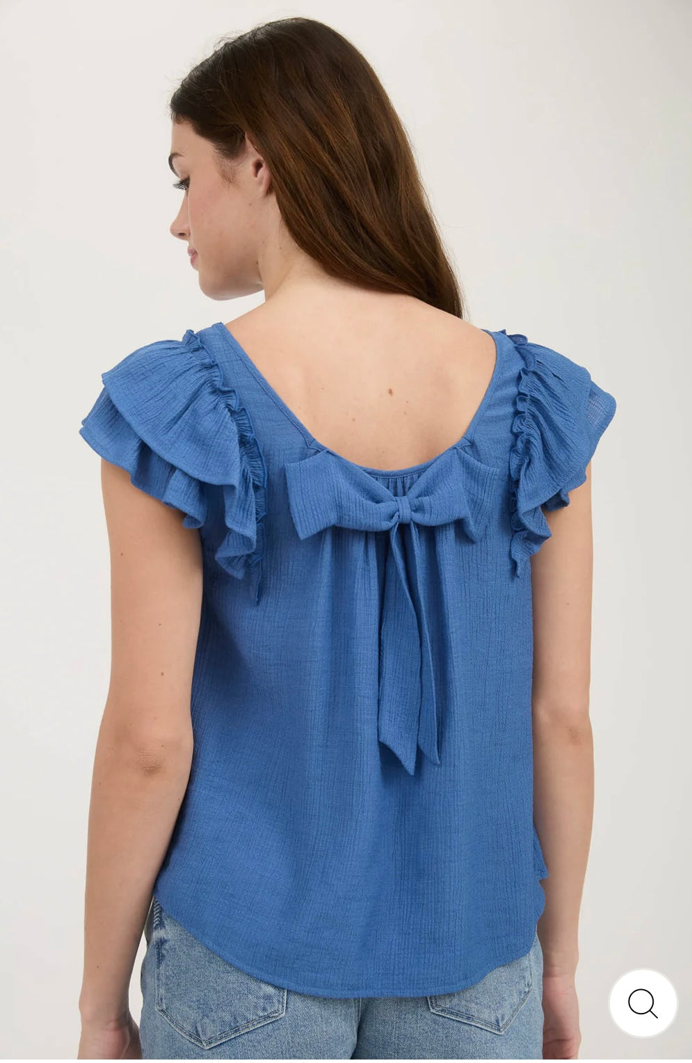 TB8904 RUFFLE DETAIL BACK BOW DETAIL SHORT SLEEVE TOP - MEDIUM BLUE