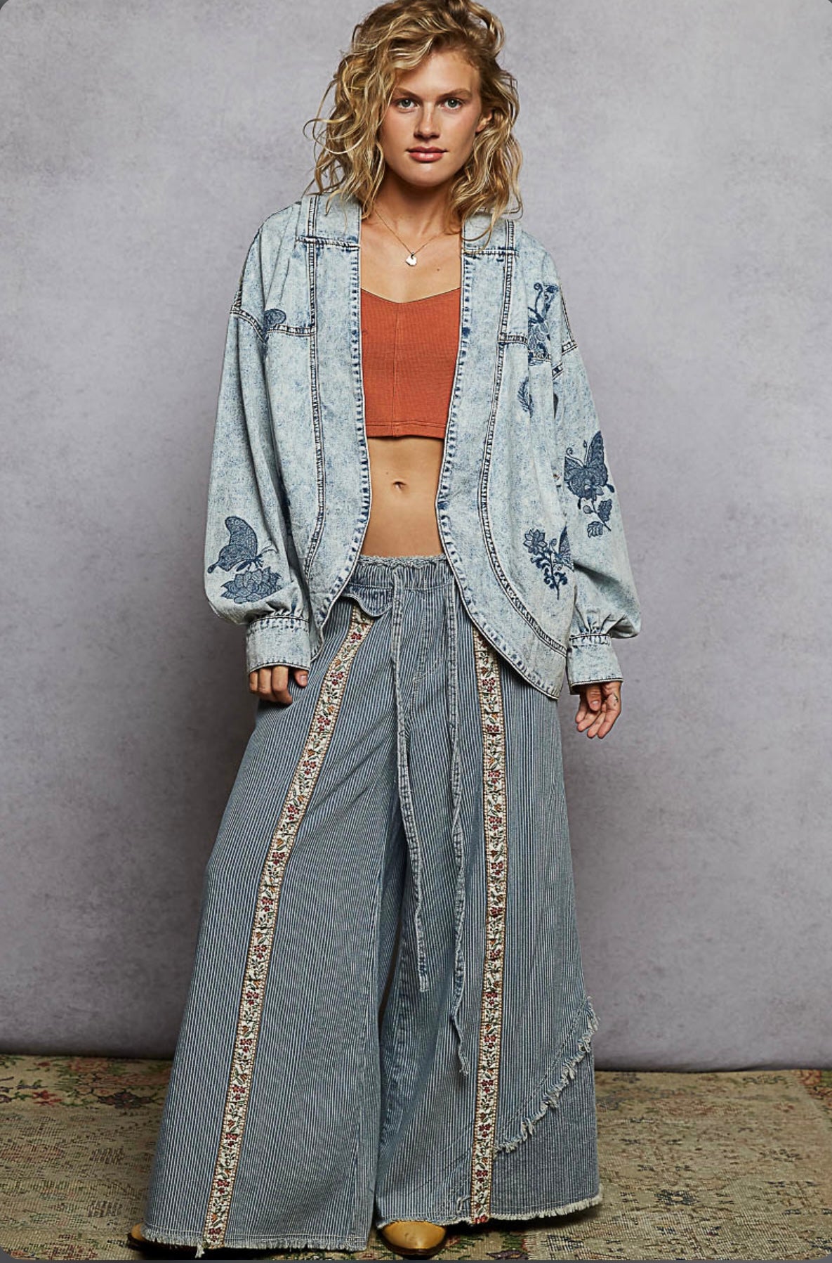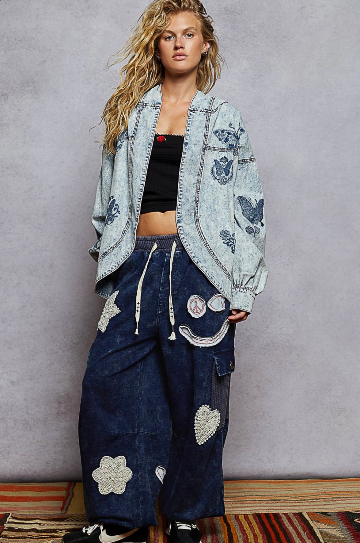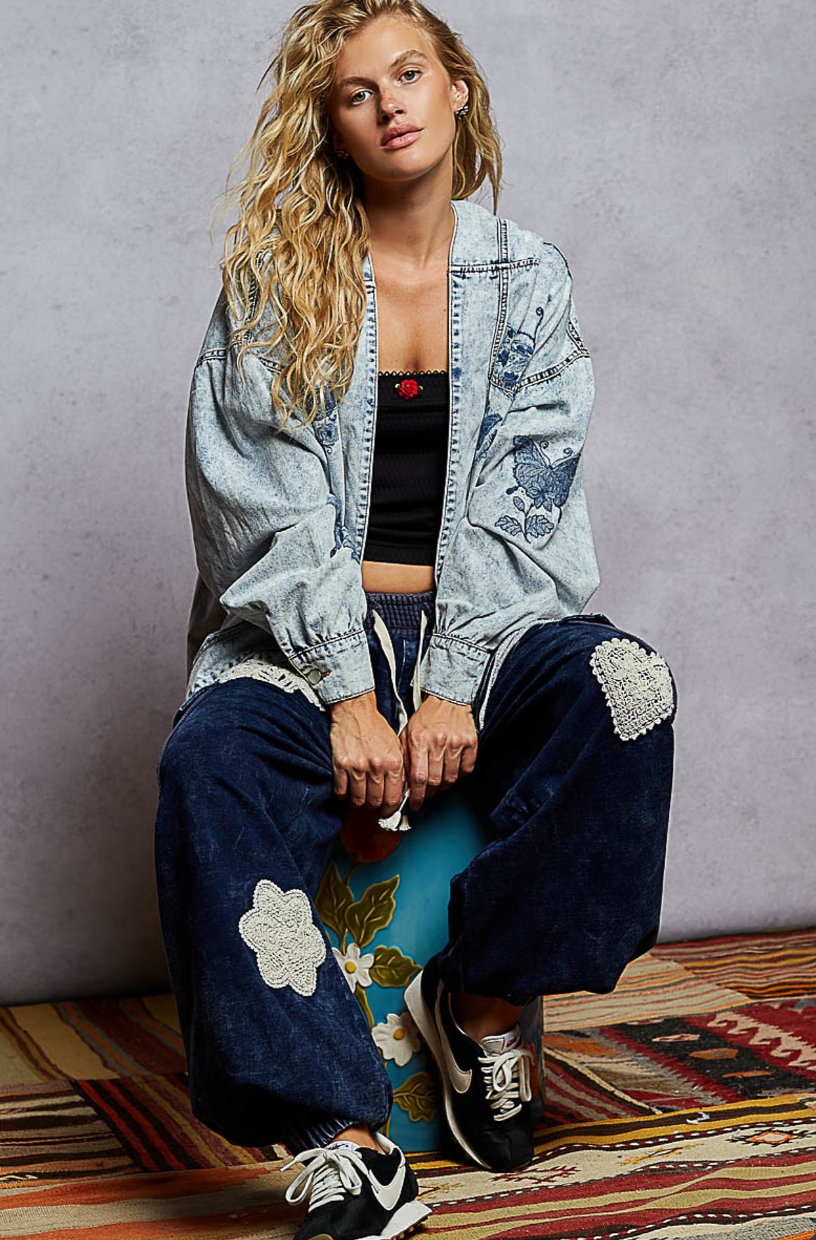 Balloon sleeve roomy fit hoodie cardigan top in denim with embroidery, side pocket inside, vintage washing, solid color.