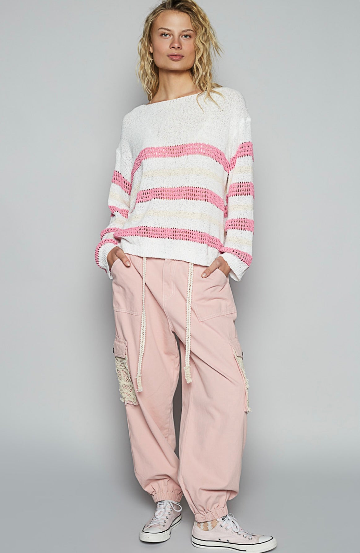 Add a pop of playful charm to your wardrobe with our Cotton Candy Striped Knit Sweater. This lightweight, open-weave knit features soft white fabric with cheerful pink stripes for a breezy, laid-back look. With its relaxed fit and slightly sheer design, it’s perfect for layering over tanks or bralettes on warm days or throwing on with joggers for a cozy, cute vibe.