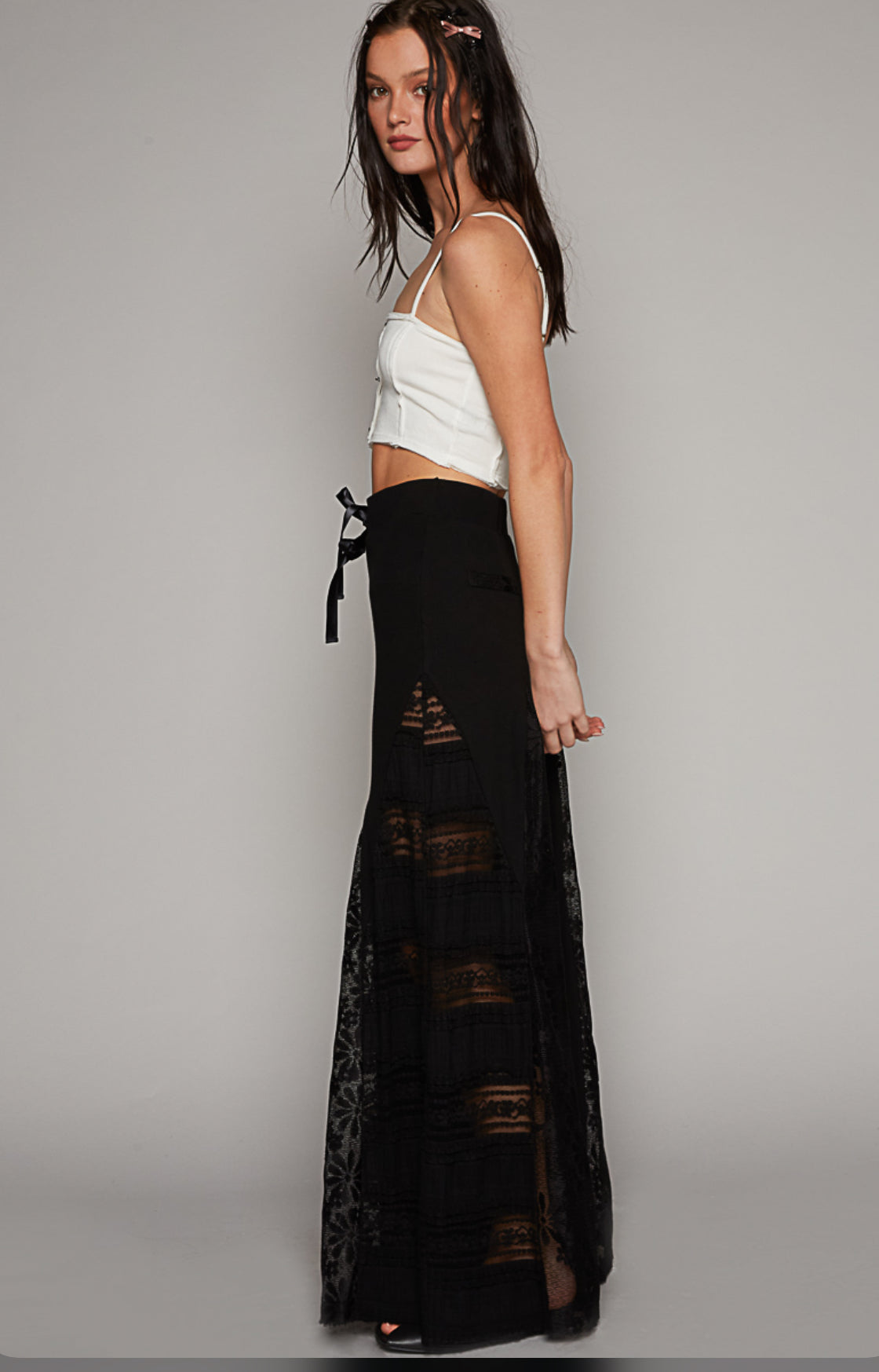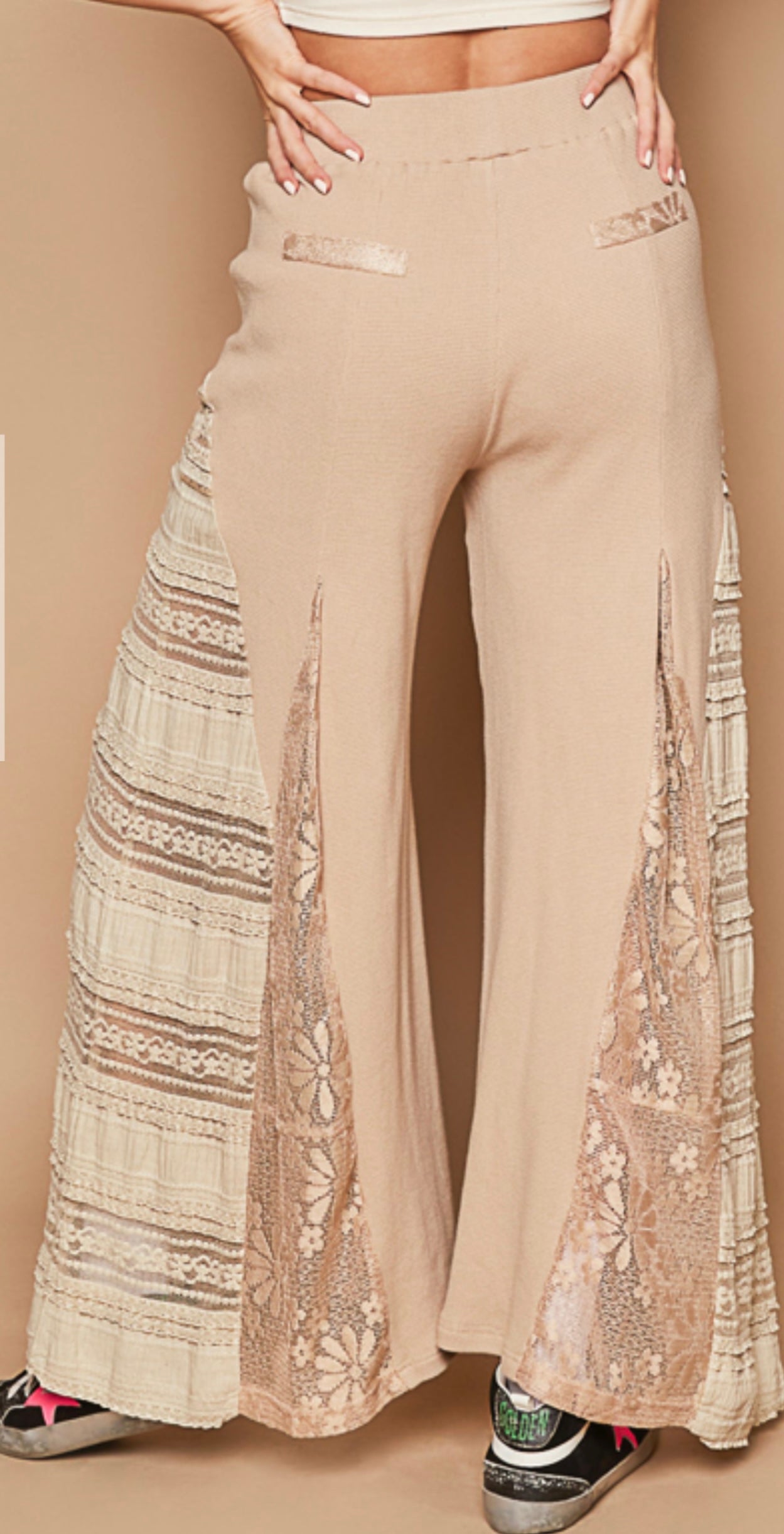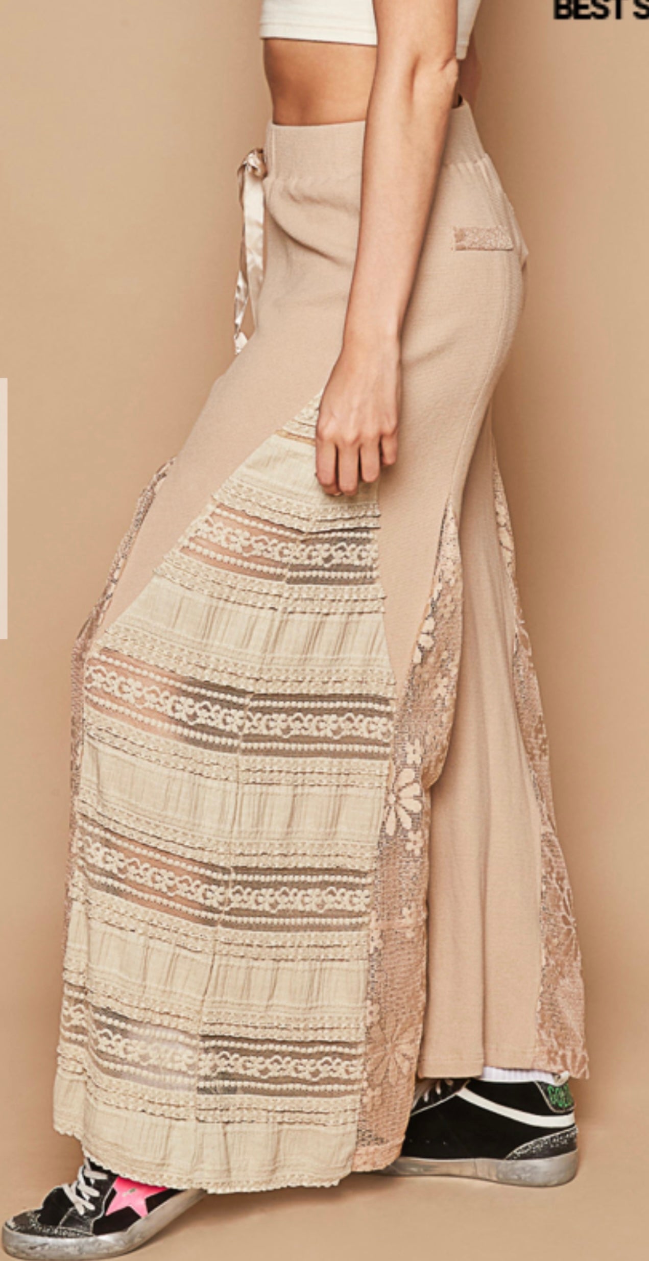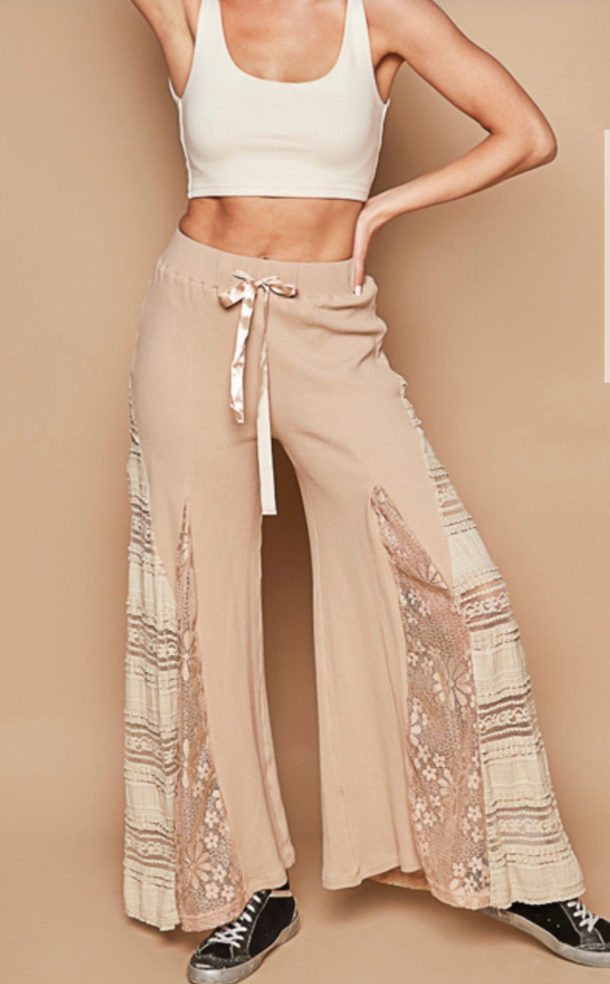 YKP112A Wide pants, thermal and lace mix with satin tie detail pointed solid pattern.