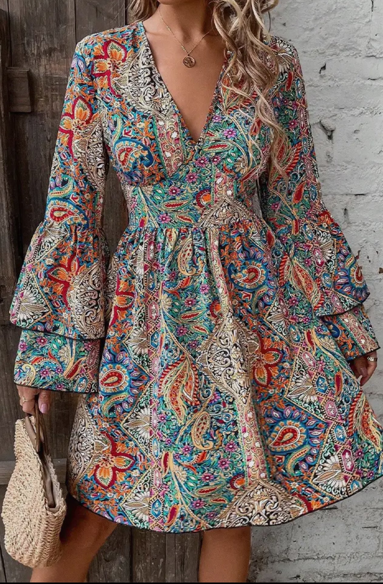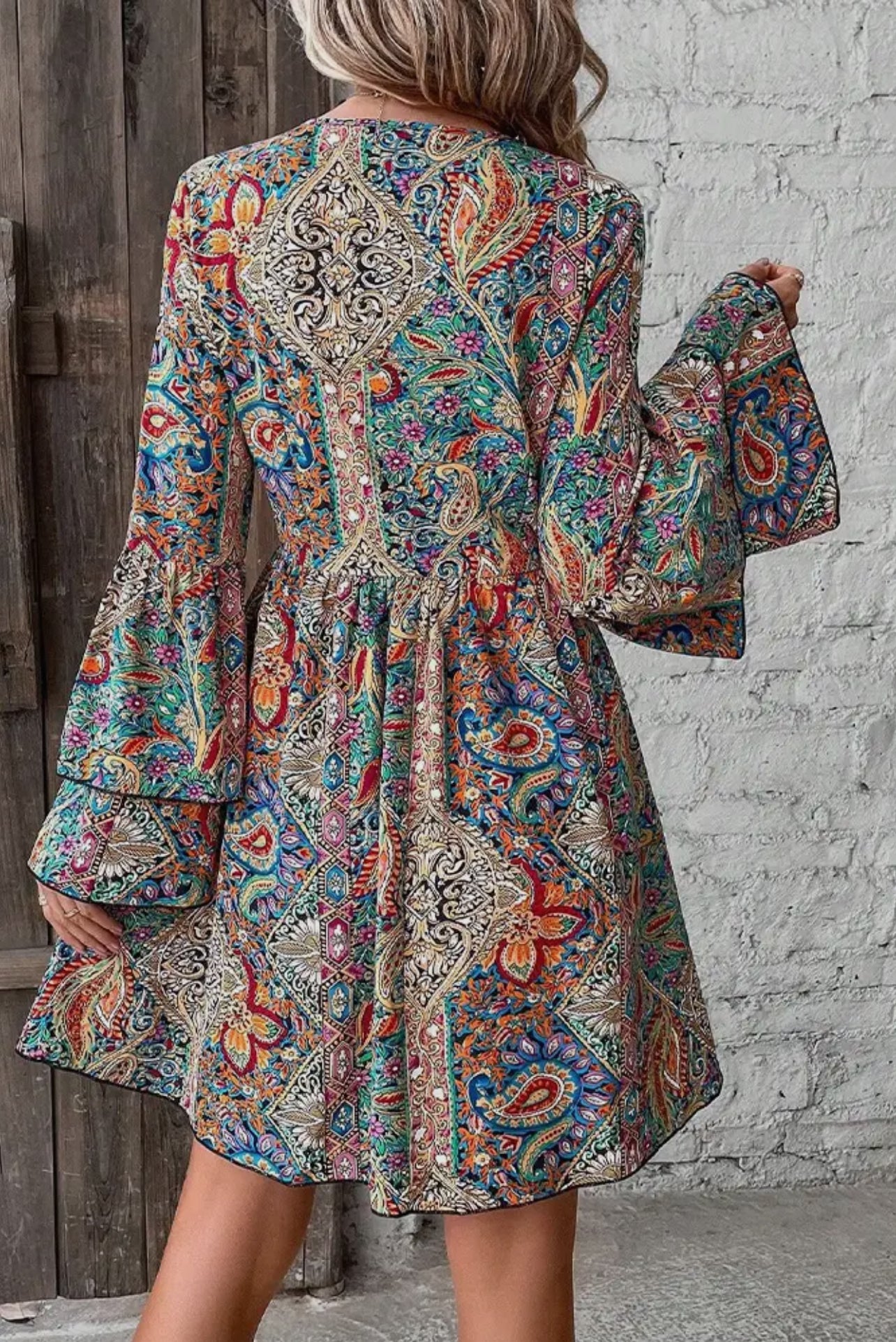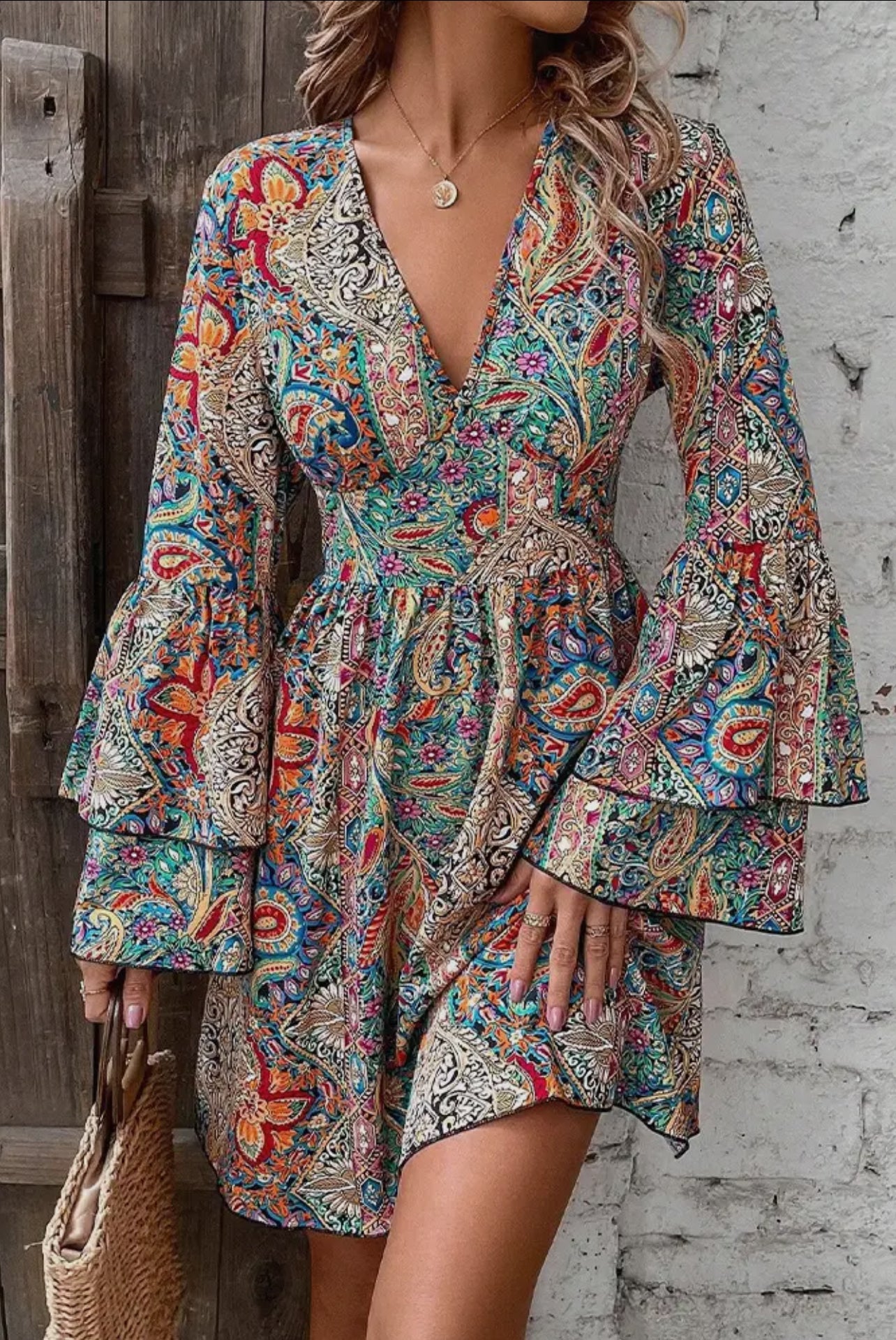 Summer Flare Sleeves V Neck Boho Printed Mini Dress with double tiered sleeves
